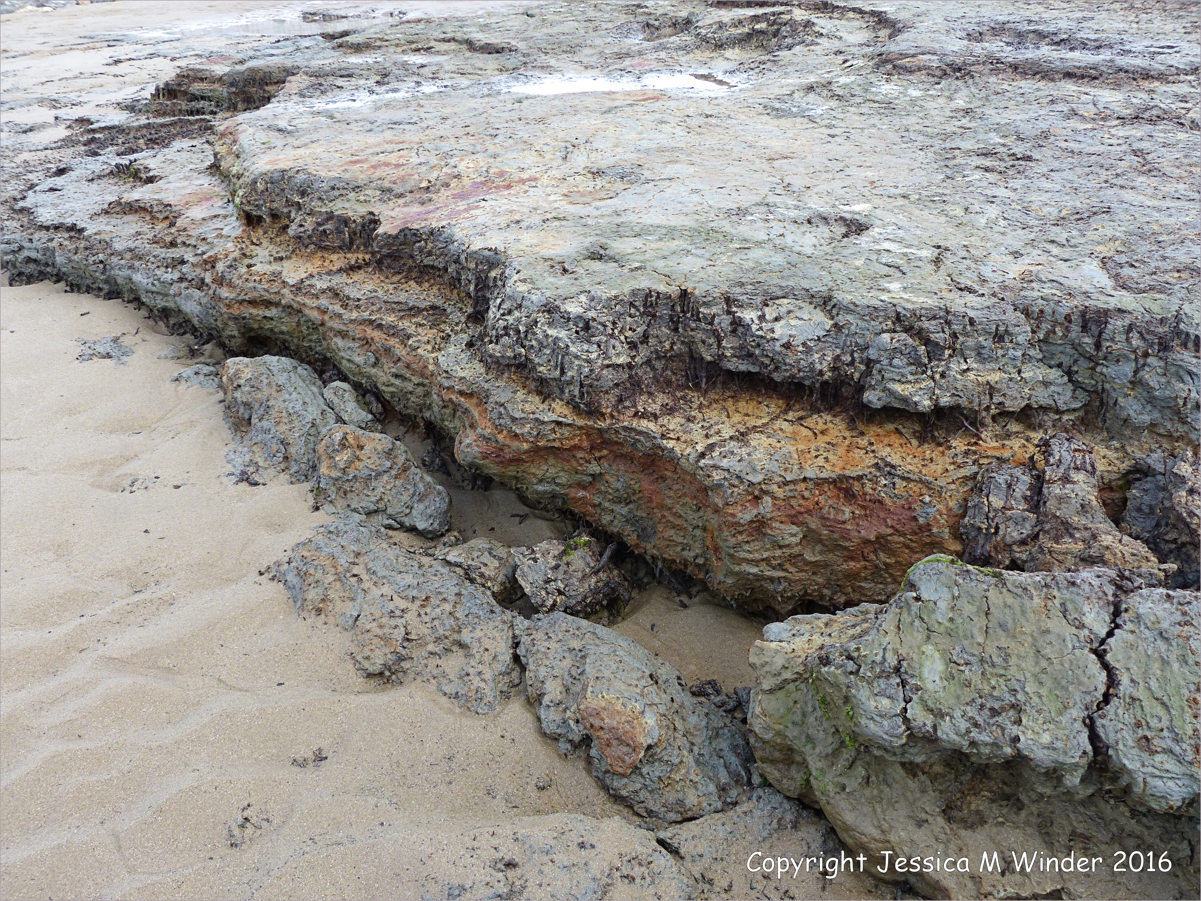 Peat at Threecliff Bay 6 – Ancient Holocene peat bed exposed beneath the pebble storm beach in the Pennard Pill valley leading to Threecliff Bay in Gower, South Wales. The edges of the peat bed show a cross-section through the layers of peat and clay. The iron deposits are caused by decomposition of the organic peat.
