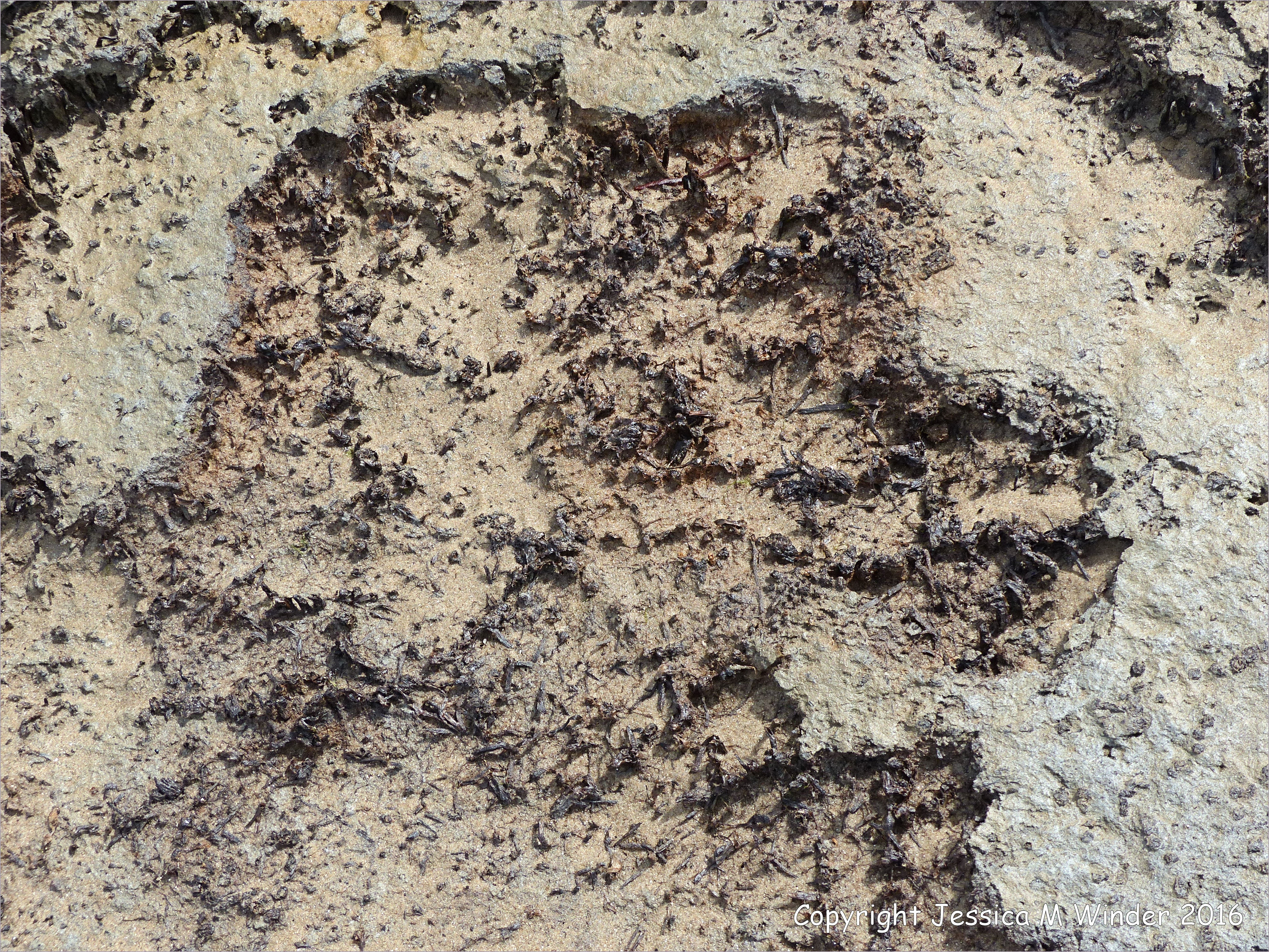 Peat at Threecliff Bay 14 – Ancient Holocene peat bed exposed beneath the pebble storm beach in the Pennard Pill valley leading to Threecliff Bay in Gower, South Wales. Surface view showing cross-sections of salt-marsh plant remains.