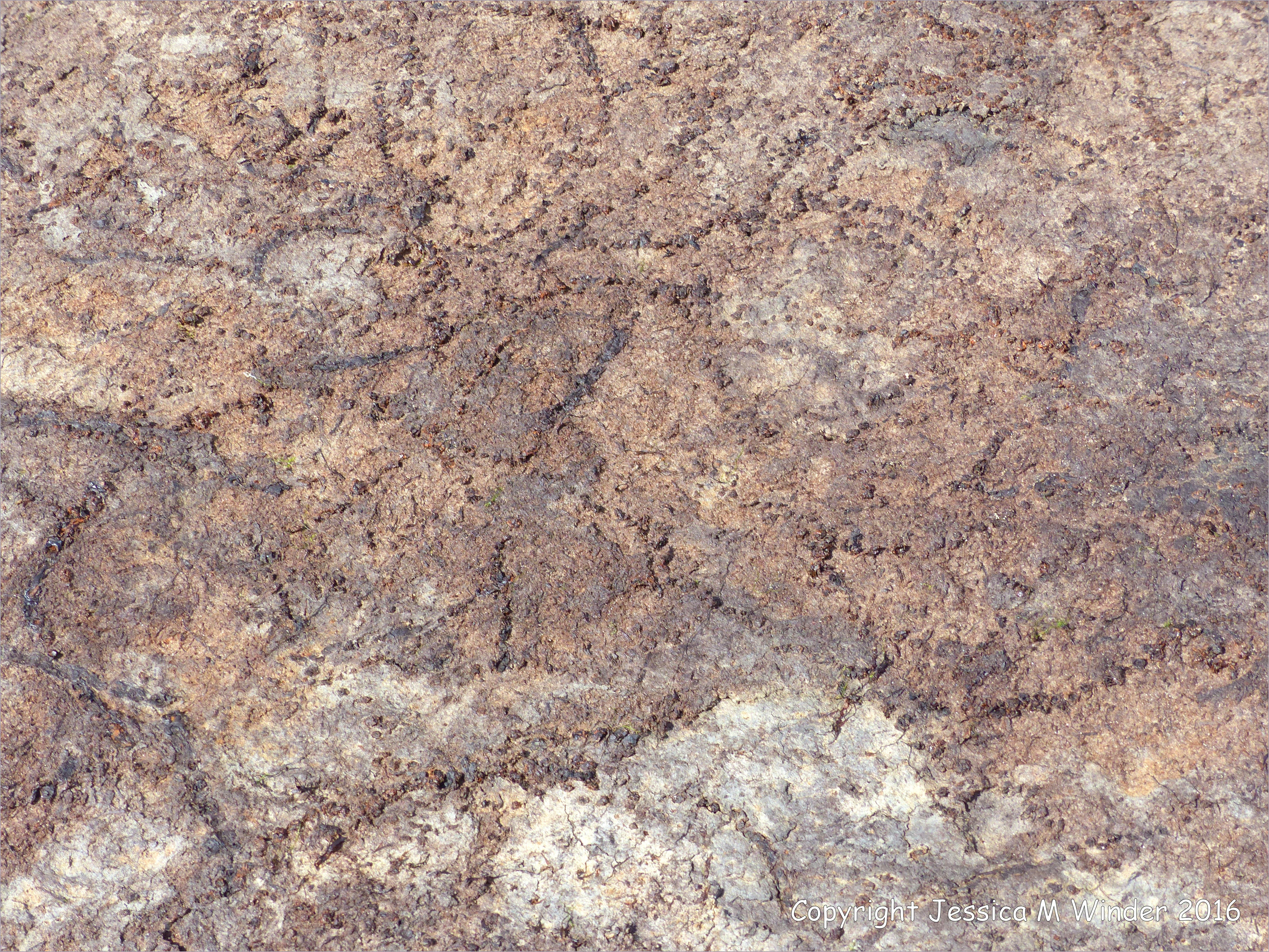 Peat at Threecliff Bay 25 – Ancient Holocene peat bed exposed beneath the pebble storm beach in the Pennard Pill valley leading to Threecliff Bay in Gower, South Wales. Surface view showing rusty deposits and dotted lines that are cross-sections of plant stems running through the peat and clay.