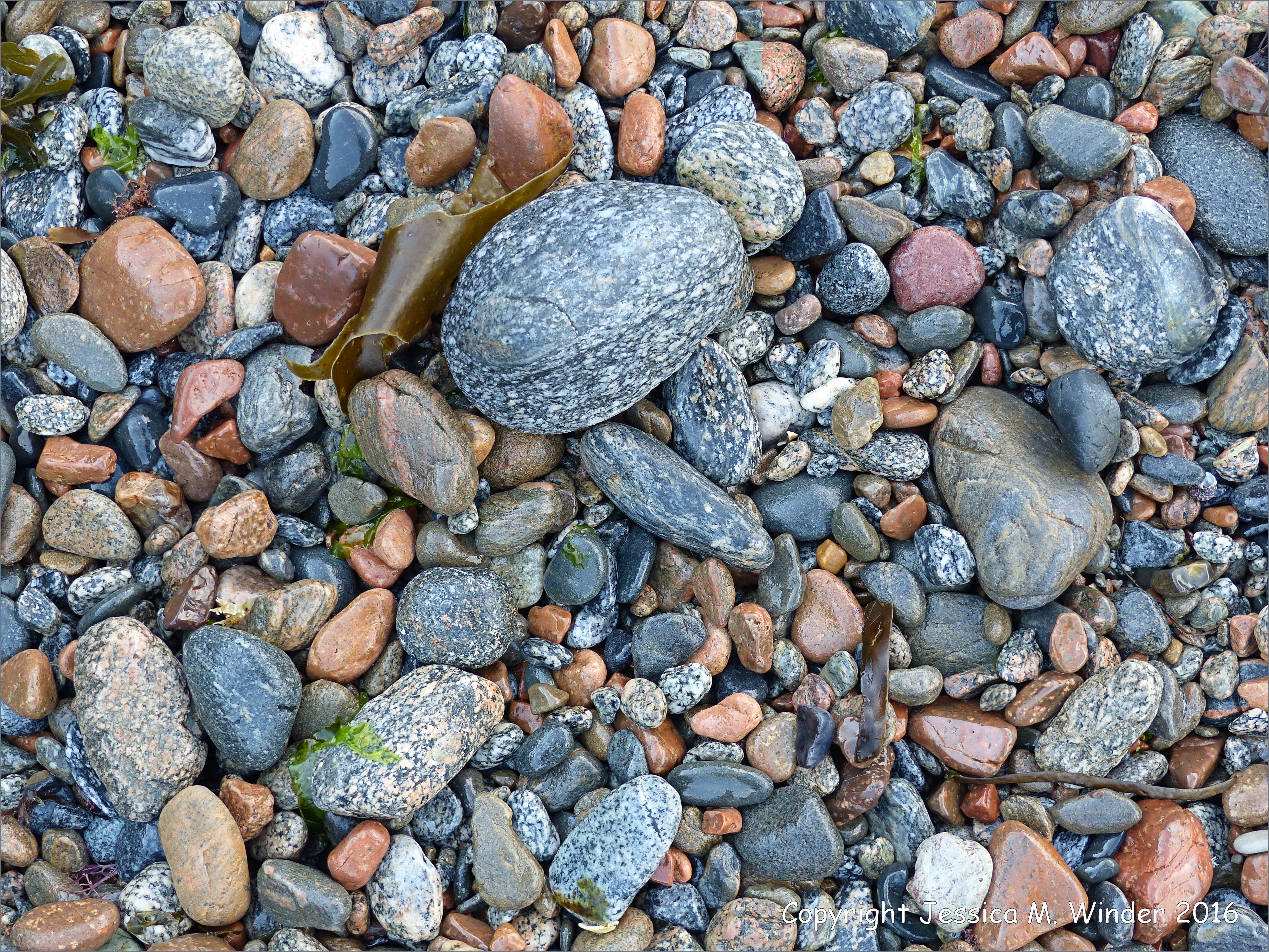 Pebbles at Havelet 9 – Coloured pebbles composed of igneous and metamorphosed rocks on the beach at Havelet on the south coast of the Channel Island of Guernsey.