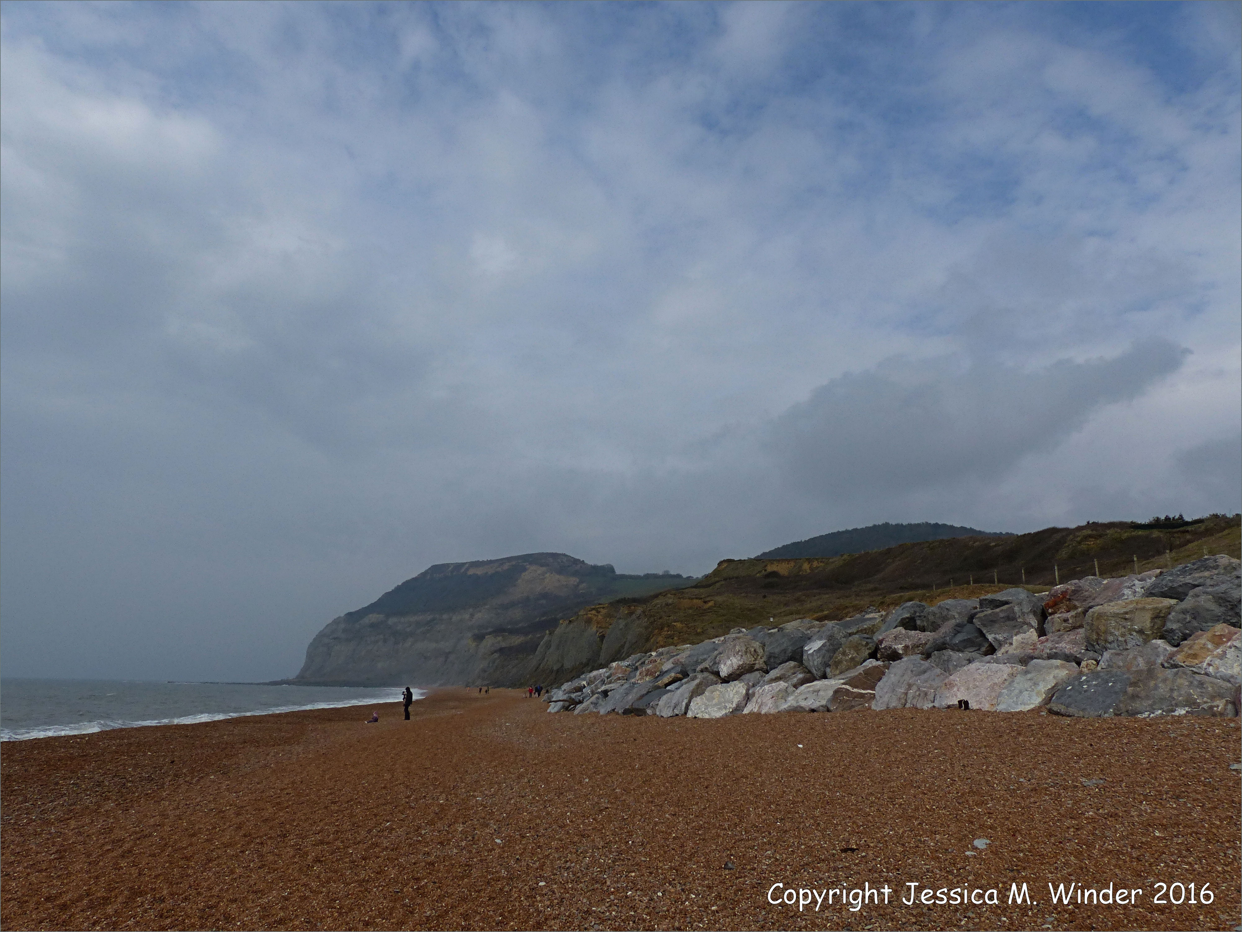 Rip-Rap at Seatown 1 – View looking west at Seatown beach, Dorset, England, showing rip-rap rock sea defences in foreground