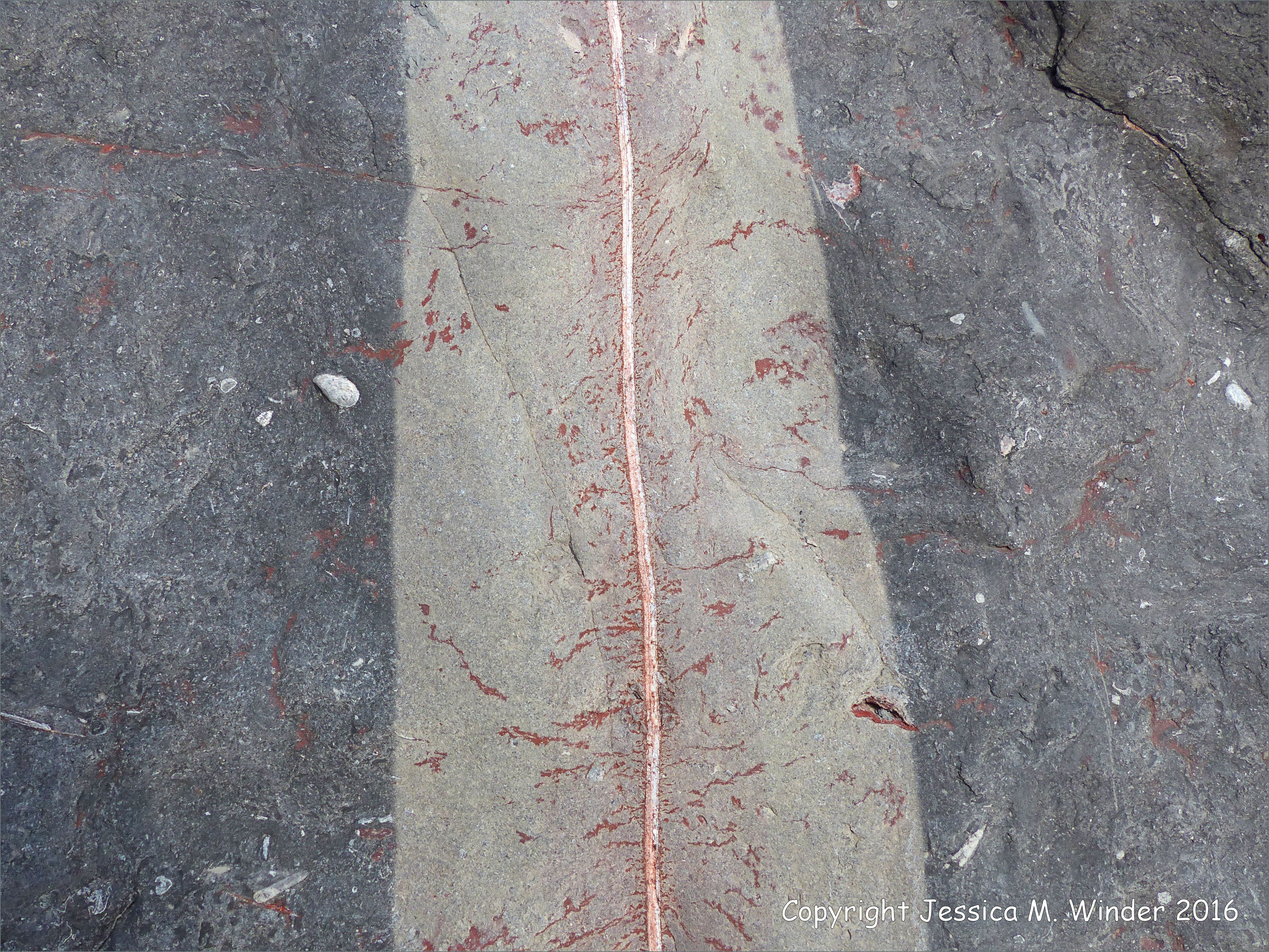 Rip-Rap at Seatown 4 – Detail of a natural pattern in a boulder forming part of rip-rap or rock armour sea defences on the beach at Seatown, Dorset, England.