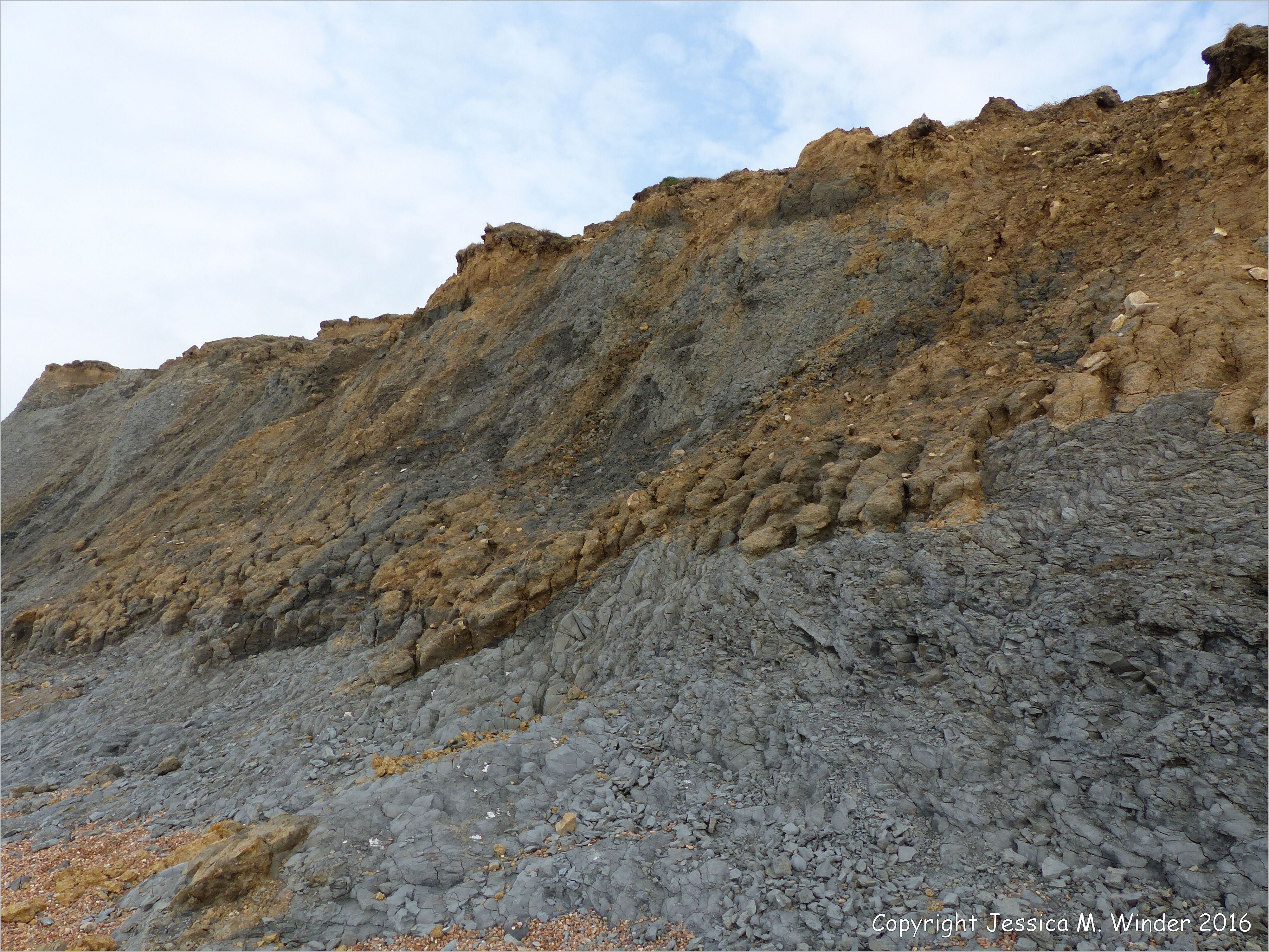 Seatown Cliffs West 5 – Cliffs of soft eroding Jurassic strata on the west side of Seatown in Dorset, England. The lower layers are the Green Ammonite Member of the Charmouth Mudstone Formation of the Lower Lias. The upper layers belong to the Dyrham Formation deposited in the Middle Lias.