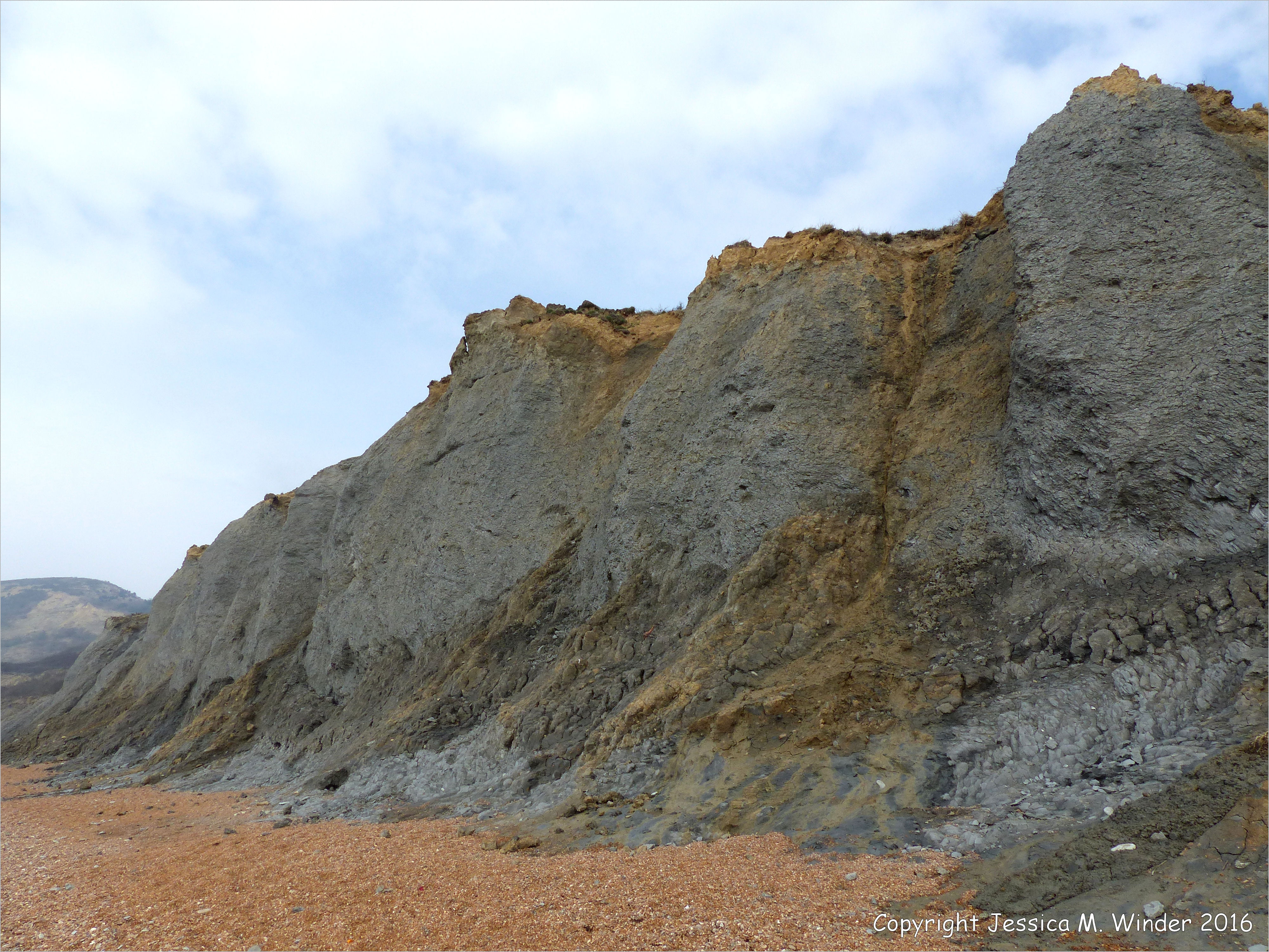 Seatown Cliffs West 1 – Cliffs of soft eroding Jurassic strata on the west side of Seatown in Dorset, England. The lower layers are the Green Ammonite Member of the Charmouth Mudstone Formation of the Lower Lias. The upper layers belong to the Dyrham Formation deposited in the Middle Lias.