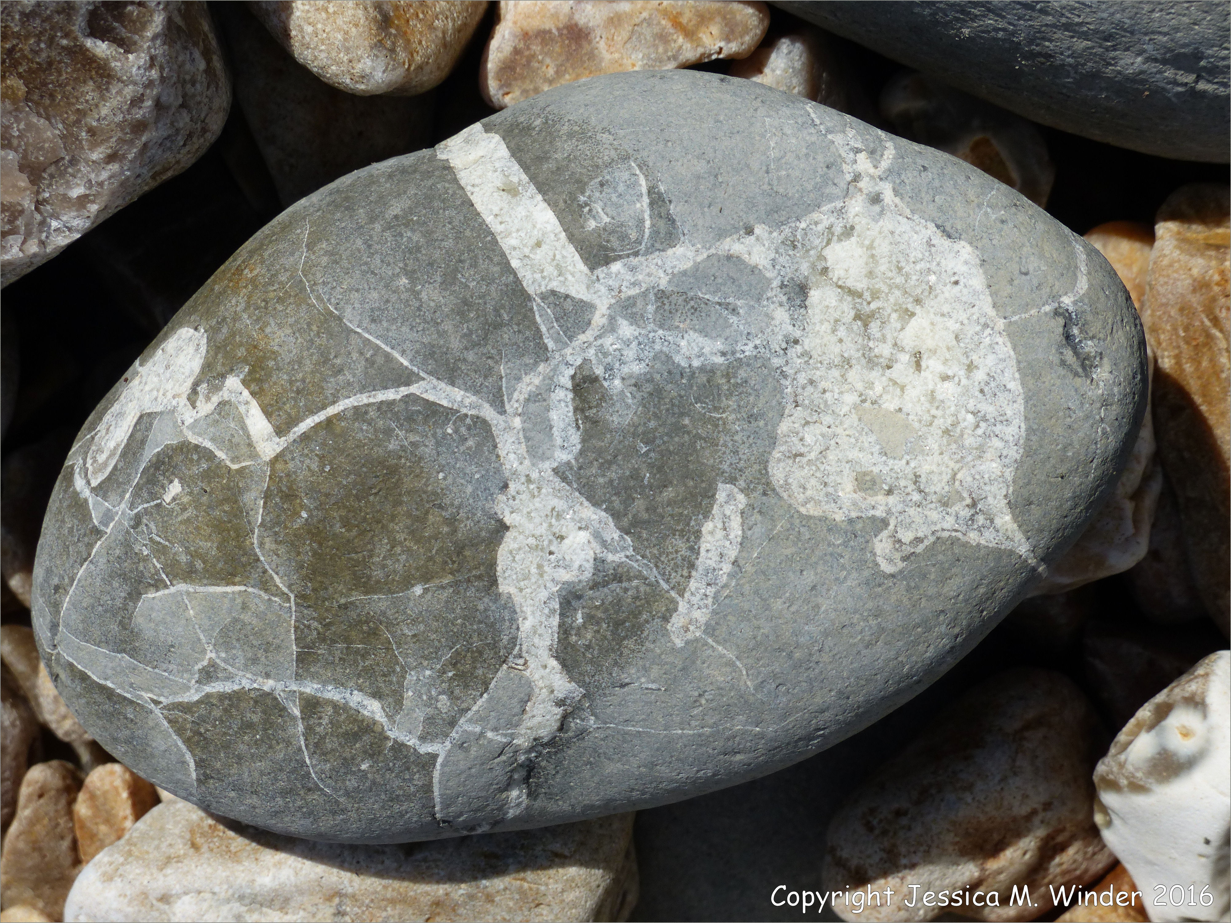 Beach Stones with White Lines 3 – Natural pattern of crystalline calcite-filled cracks in a beach stone derived from the inner core of a Birchi Nodule from the Shales-with-Beef Member of the Charmouth Mudstone Formation of the Lower Lias in the Jurassic Period at Charmouth, Dorset, England. This inner core of a Birchi Nodule is also known as a septarian nodule.