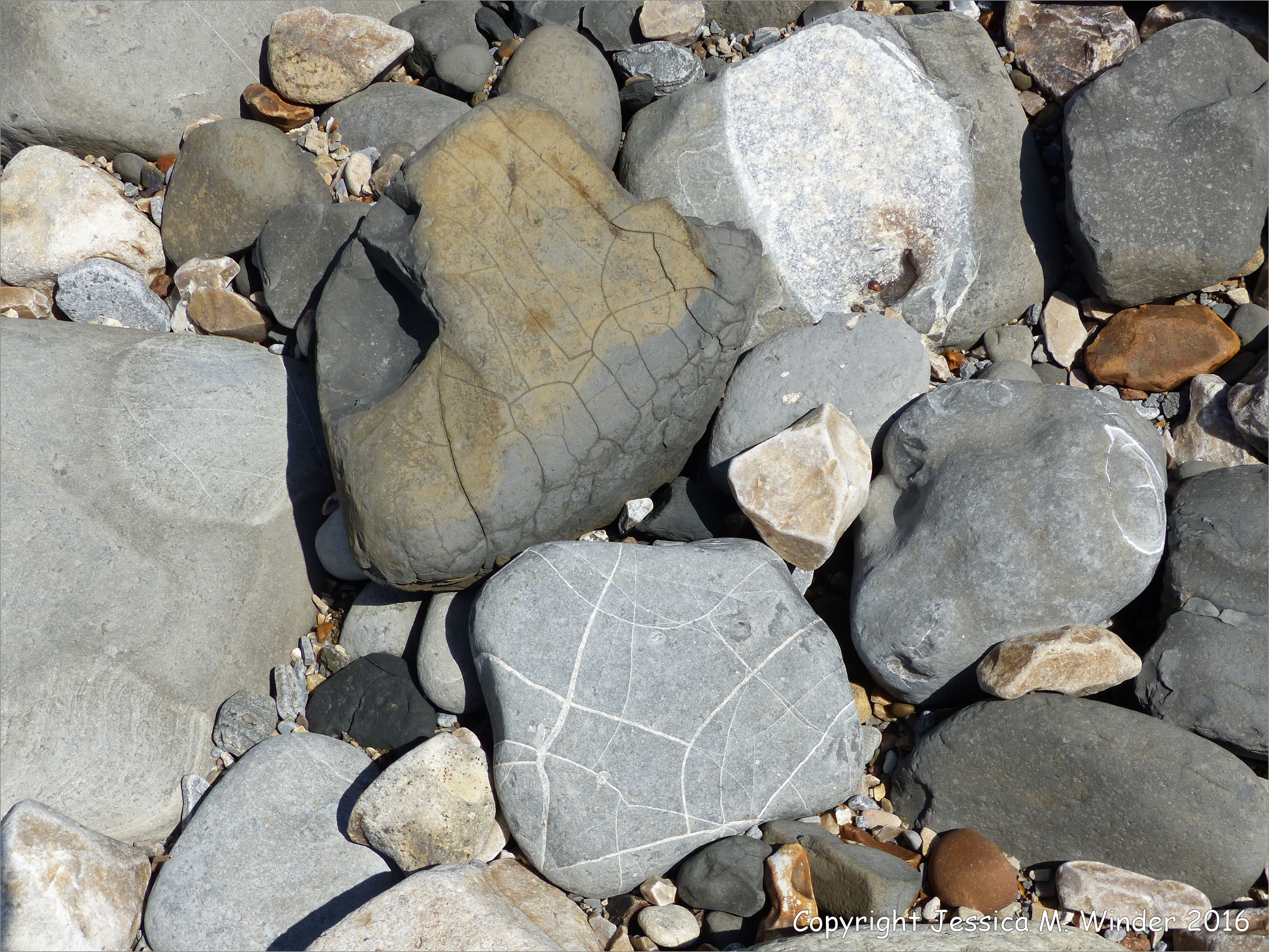 Beach Stones with White Lines 8 – Natural pattern of crystalline calcite-filled cracks in a beach stone probably derived from the inner cores of a Birchi Nodules from the Shales-with-Beef Member of the Charmouth Mudstone Formation of the Lower Lias in the Jurassic Period at Charmouth, Dorset, England. The inner core of Birchi Nodules are also known as a septarian nodules.