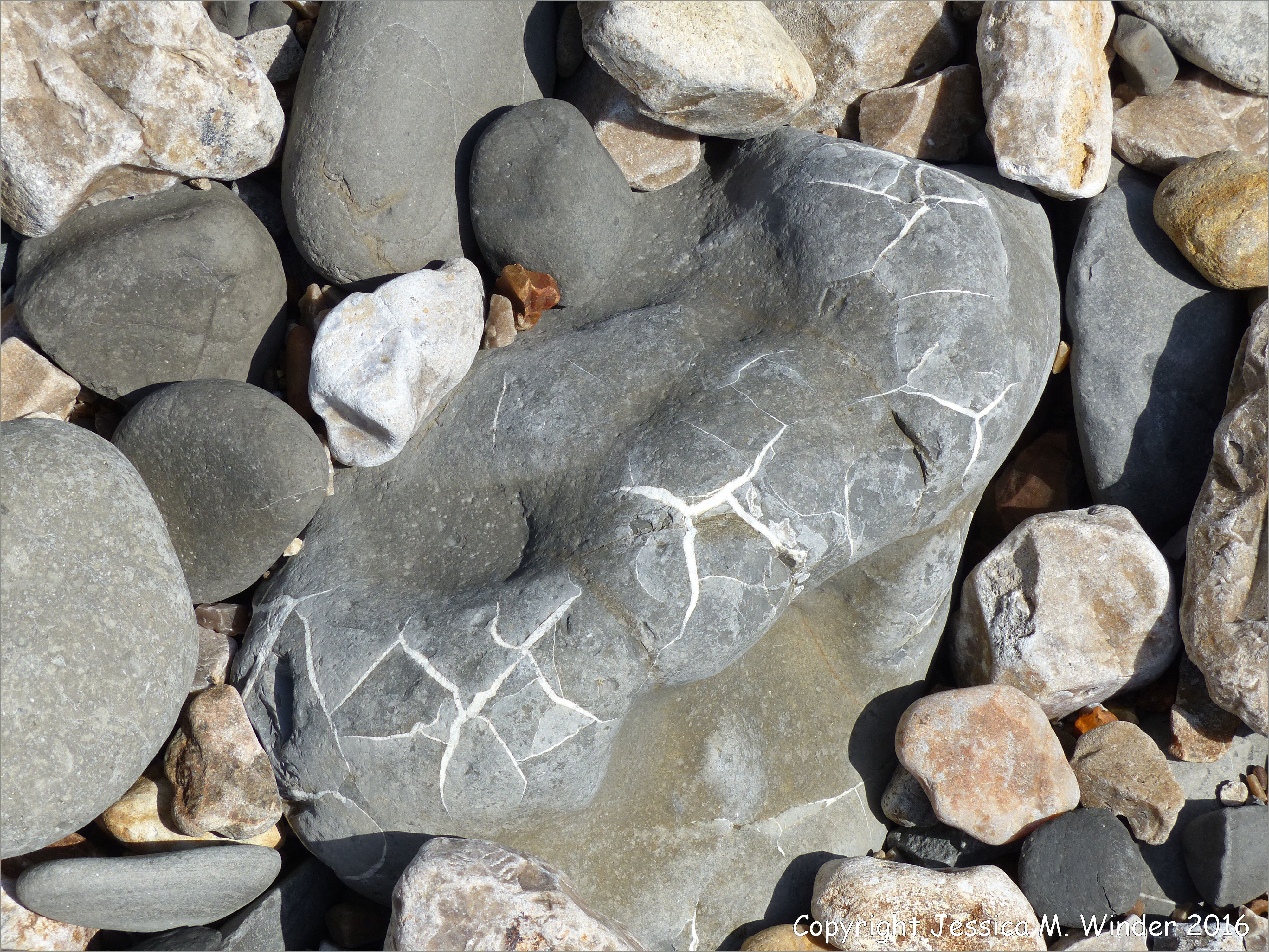 Beach Stones with White Lines 14 – Natural pattern of crystalline calcite-filled cracks in a beach stone derived from the inner core of a Birchi Nodule from the Shales-with-Beef Member of the Charmouth Mudstone Formation of the Lower Lias in the Jurassic Period at Charmouth, Dorset, England. This inner core of a Birchi Nodule is also known as a septarian nodule.