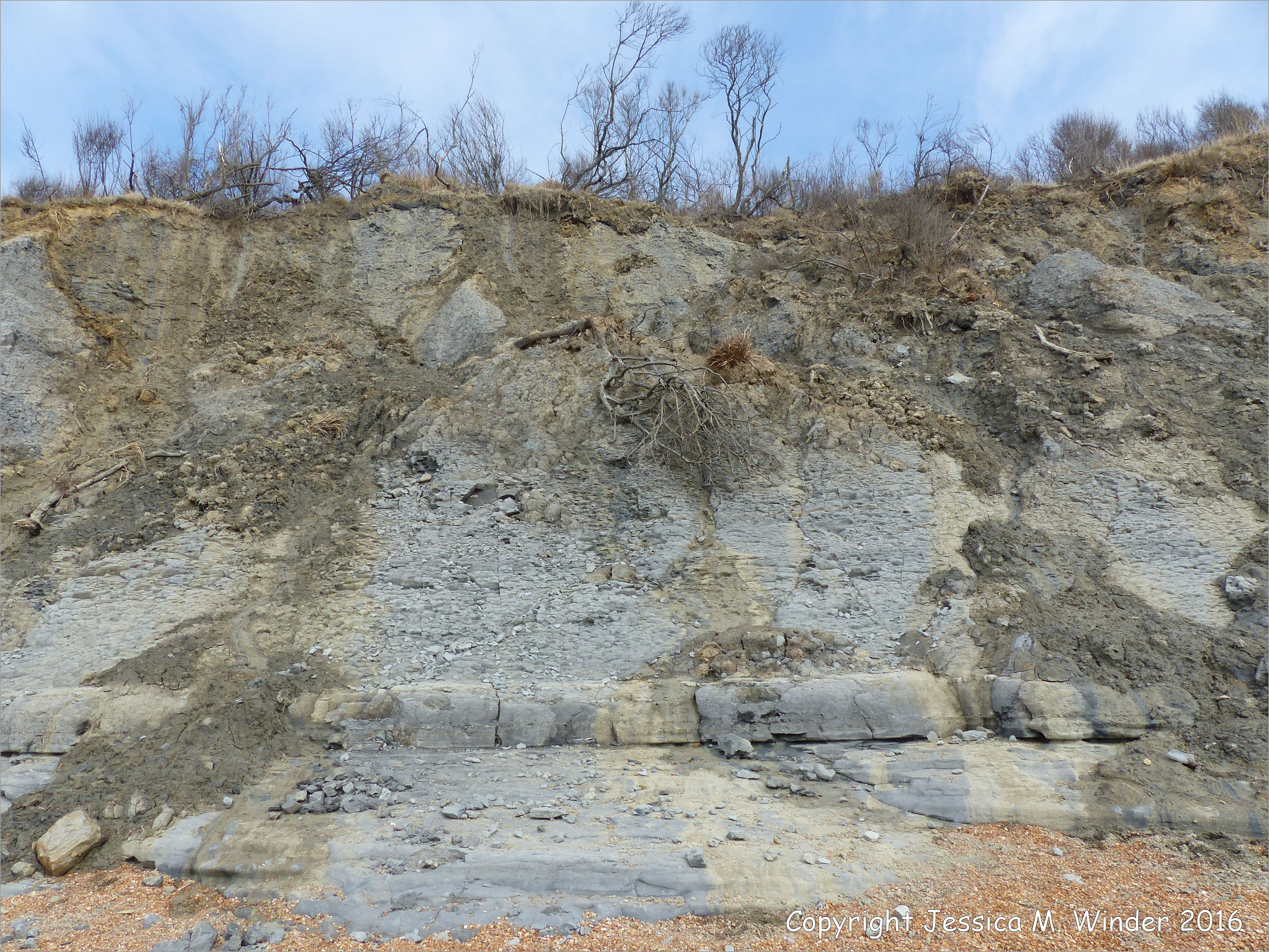 Belemnites at Seatown 3 – Cliff face at Seatown, Dorset, England showing the ledge of Belemnite Stone and layers of Belemnite Marl below and Green Ammonite Member above.