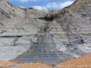 Belemnites at Seatown 6 – Cliff face on the western shore at Seatown, Dorset, England showing the ledge of Belemnite Stone with layers of Belemnite Marl below and Green Ammonite Member above.