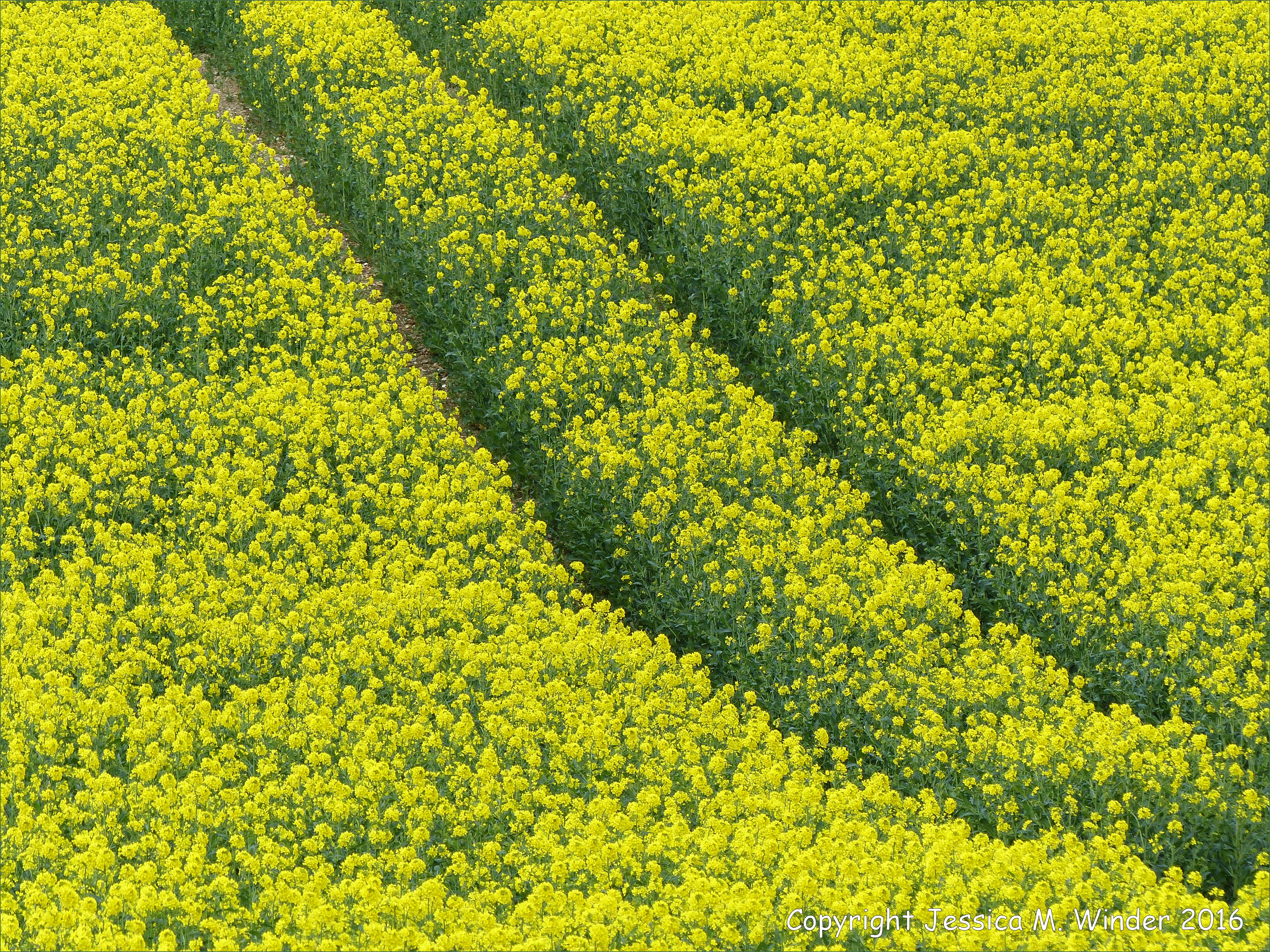 Oilseed Rape at Charlton Down 2 – Fields of yellow flowering oilseed rape crop at Charlton Down, Dorset, England, 25 April 2016, showing tractor ‘tram-lines’ through the crop.