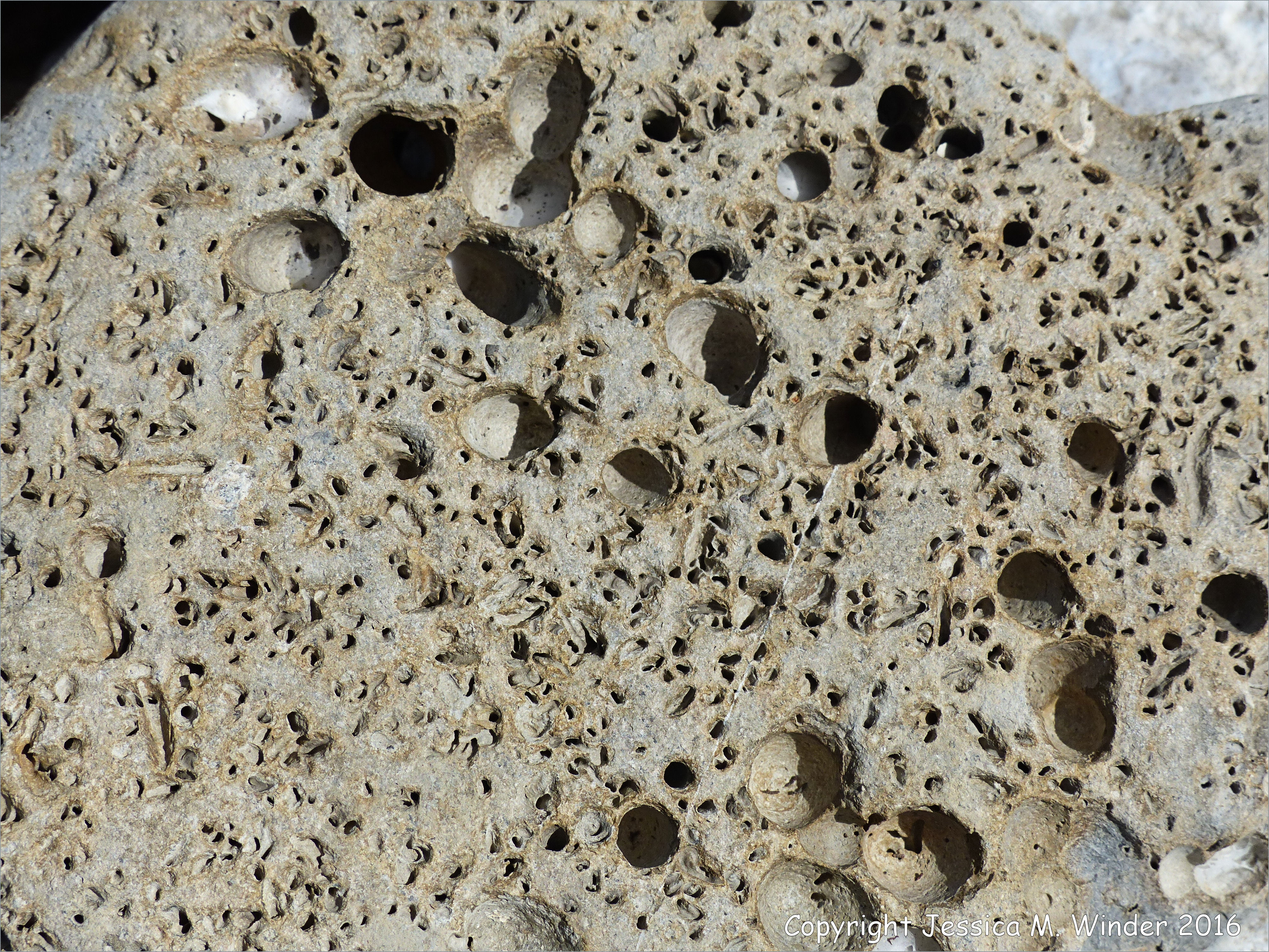 Stones With Holes at Charmouth Beach 4 – Close-up of a beach stone with holes made by marine invertebrates at Charmouth, Dorset, England. The larger holes were made by boring bivalve molluscs like Hiatella and the smaller holes are the entry and exit holes of burrows made my marine polychaete worms like the Polydora species.