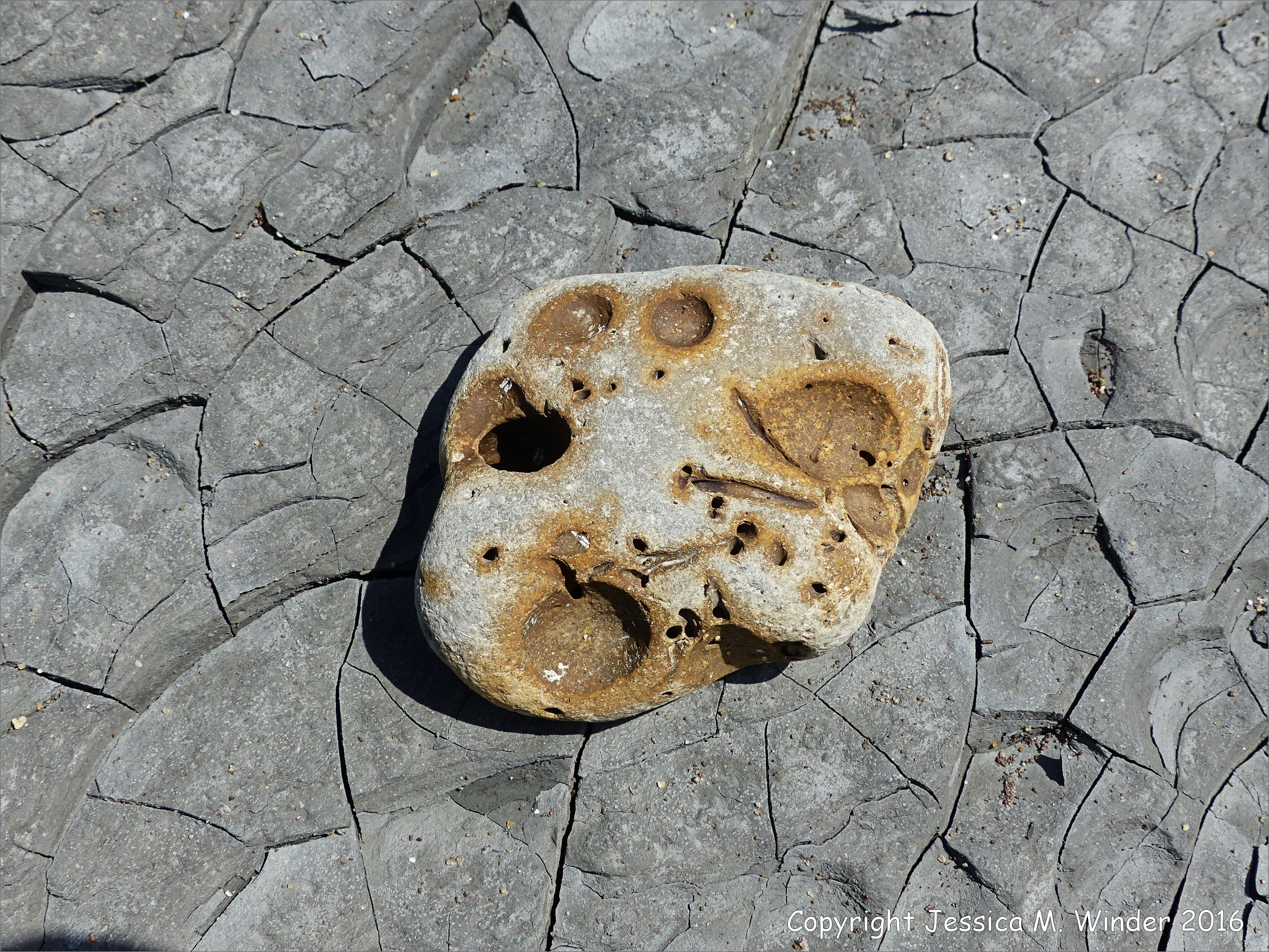 Stones With Holes at Charmouth Beach 8 – Beach stone with holes made by marine invertebrates at Charmouth, Dorset, England. The larger rounder holes have been made by boring bivalve molluscs such as the Common Piddock (Pholas dactylus) or the Wrinkled Rock Borer (Hiatella arctica); and the smaller holes by marine polychaete worms like the Polydora spp.