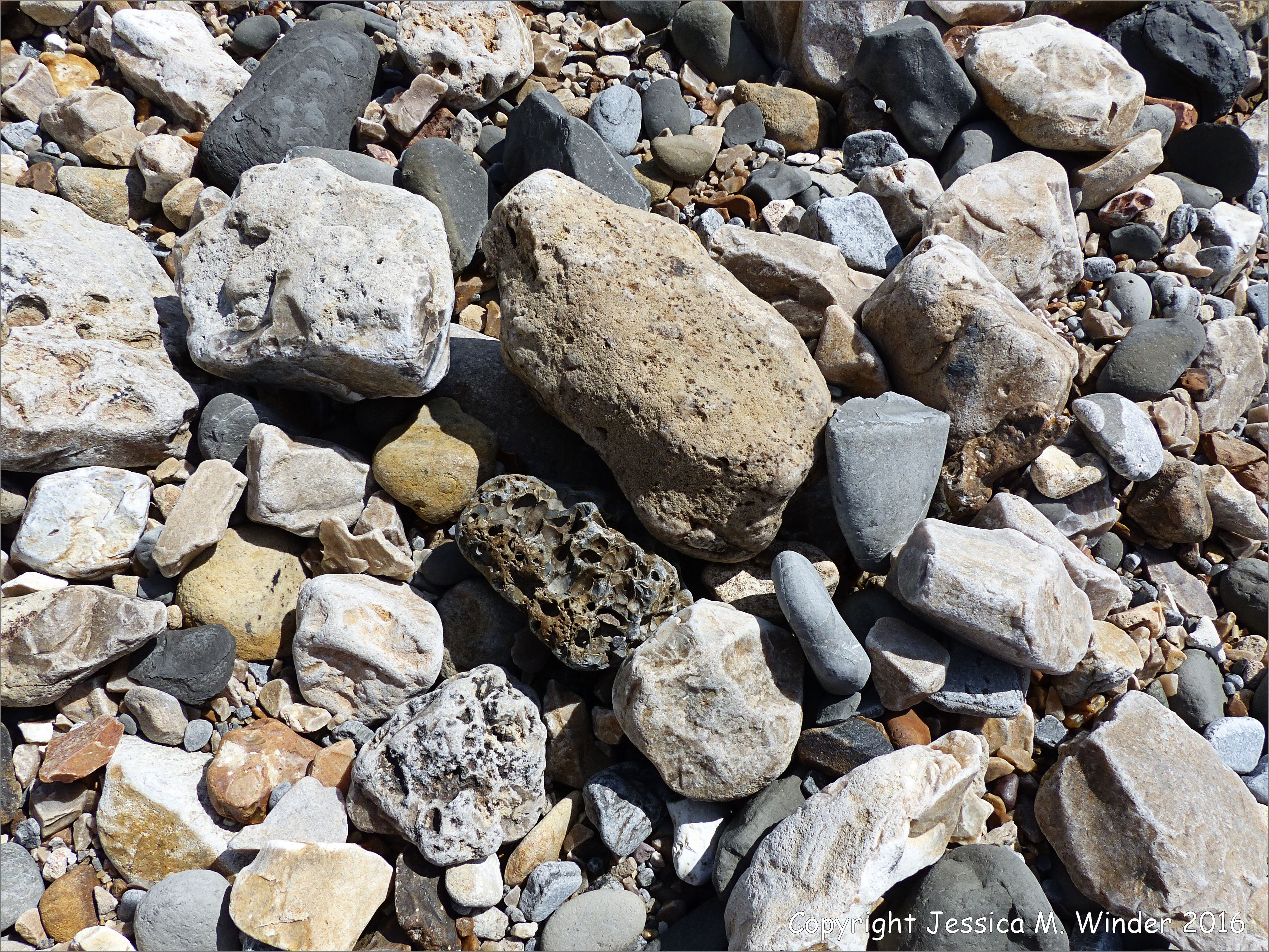 Stones With Holes at Charmouth Beach 10 – Beach stones including one with holes made by marine invertebrates at Charmouth, Dorset, England.