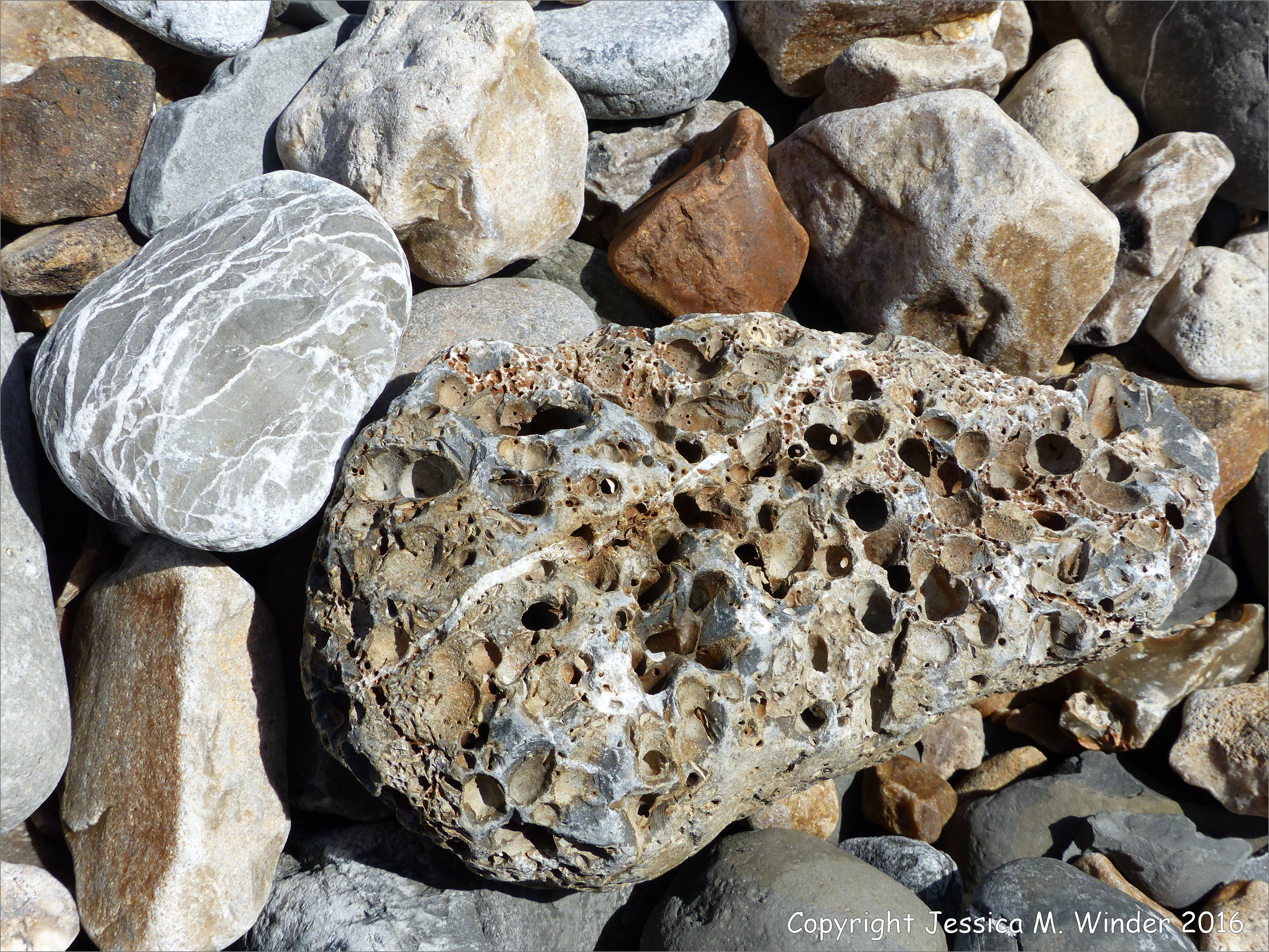 Stones With Holes at Charmouth Beach 12 – Beach stone with holes made by marine invertebrates at Charmouth, Dorset, England. The larger rounder holes have been made by boring bivalve molluscs such as Hiatella arctica and the smaller holes by marine polychaete worms like the Polydora spp.
