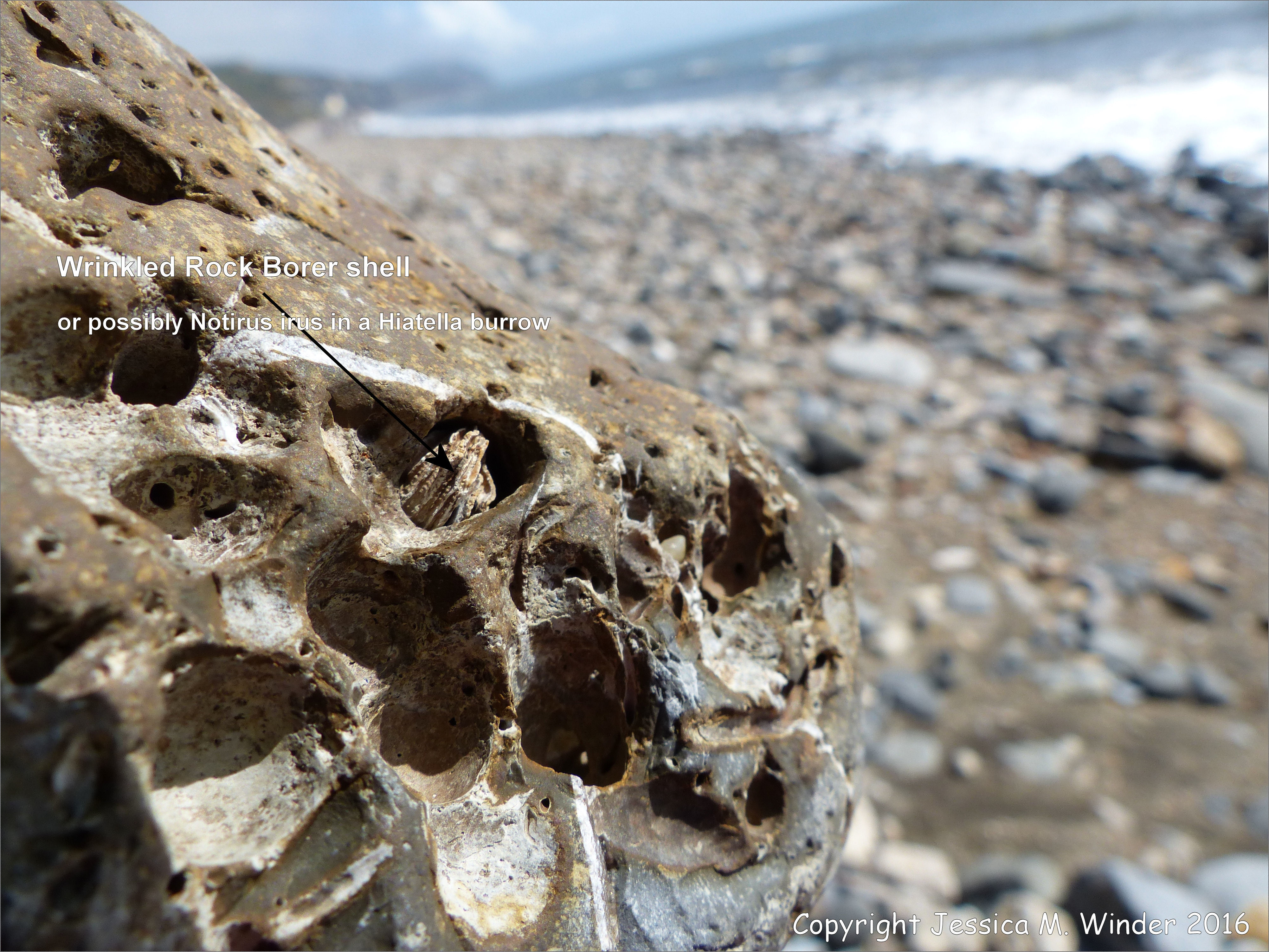 Stones With Holes at Charmouth Beach 20 – Beach stone with holes made by marine invertebrates at Charmouth, Dorset, England. The larger holes are made by boring bivalve molluscs and the smaller holes by marine polychaete tube worms. The larger holes may have been created by the Wrinkled Rock Borer Hiatella arctica. The shell remaining in the burrow could be Hiatella or maybe the burrow has been secondarily occupied by Irus irus.