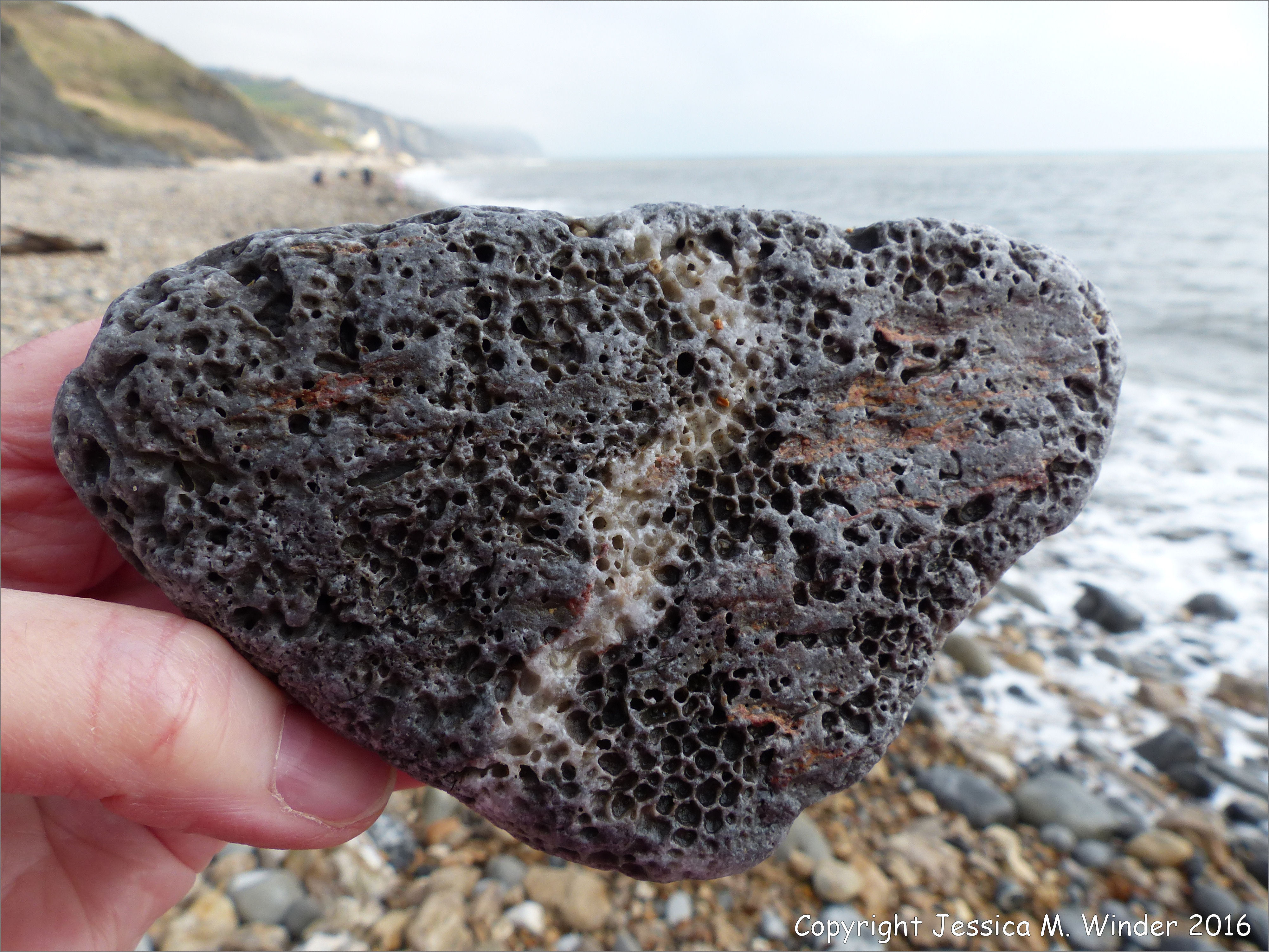 Stones With Holes at Charmouth Beach 21 – Beach stone with holes most likely made by a sponge such as Cliona celata.