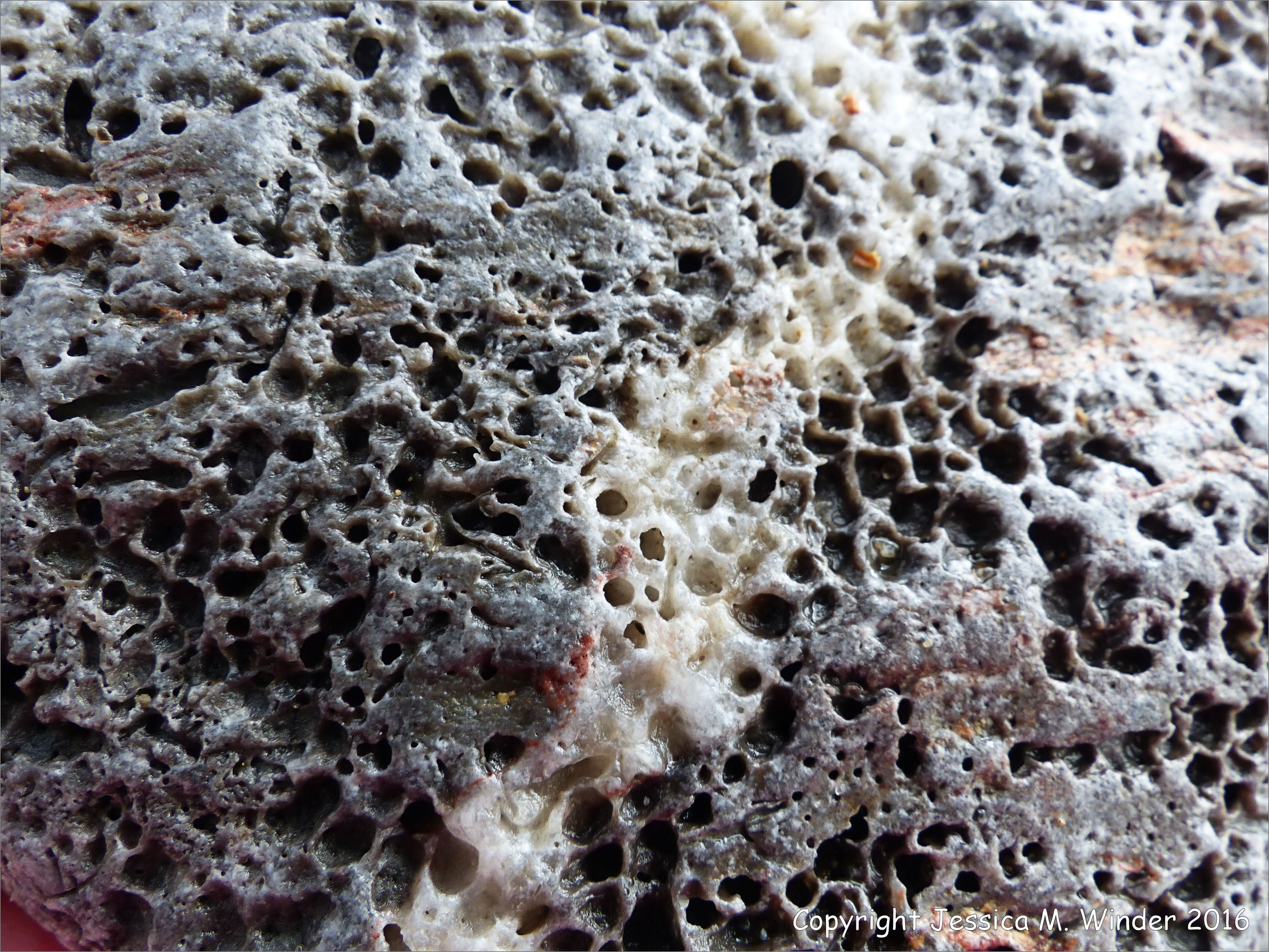 Stones With Holes at Charmouth Beach 22 – Beach stone with holes most likely made by a sponge such as Cliona celata.