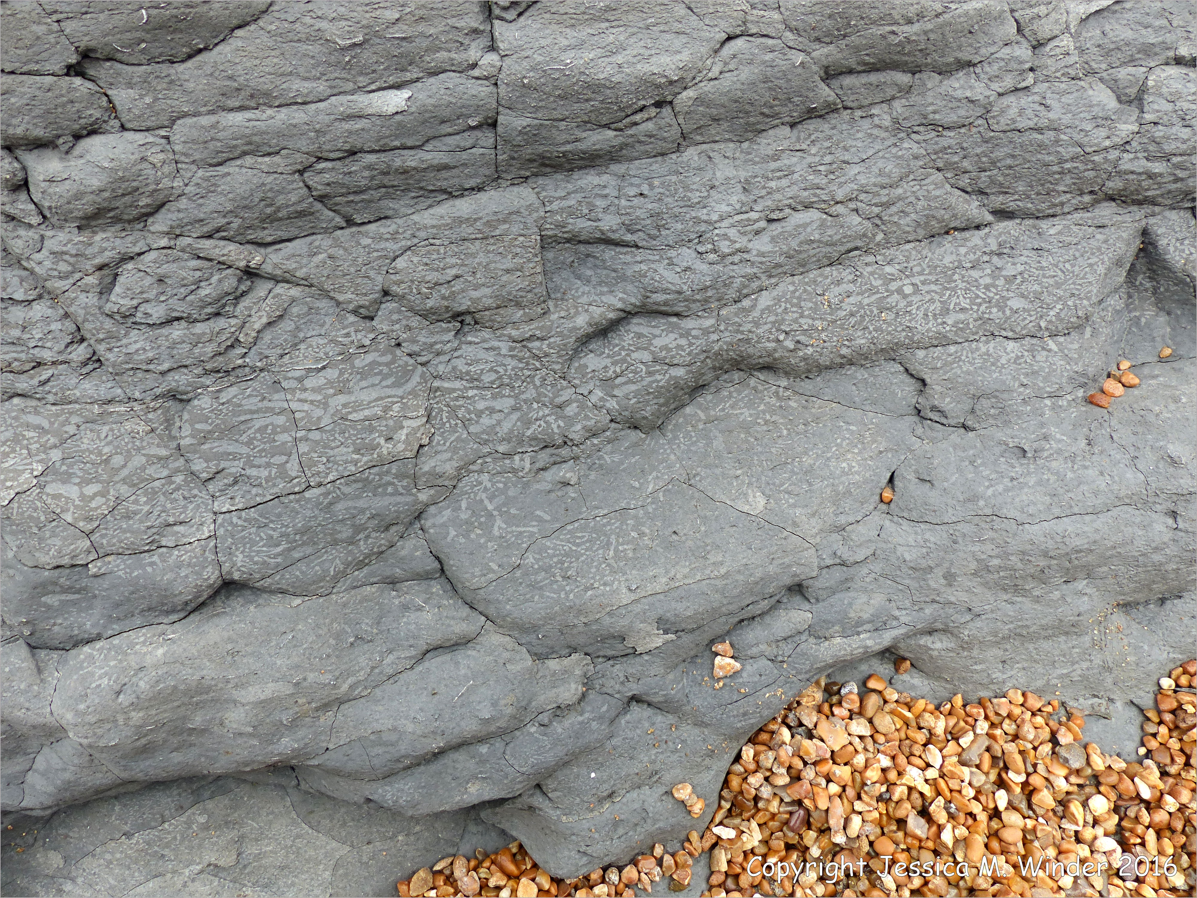 Seatown Trace Fossils 9 – Trace or ichno fossils of marine invertebrate burrows in the Belemnite Marls from the Jurassic Period at Seatown in Dorset, England.