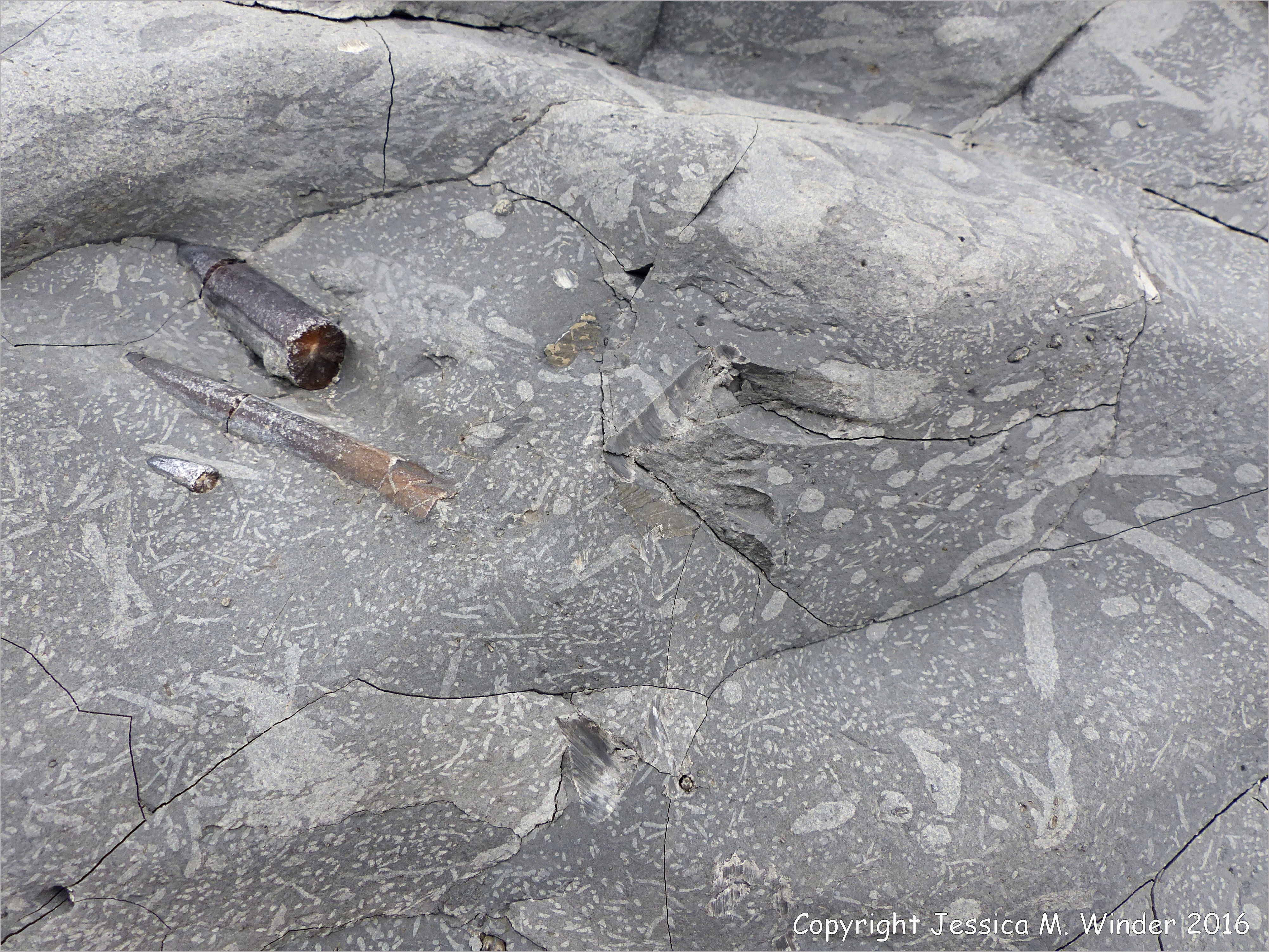 Seatown Trace Fossils 15 – Trace or ichno fossils of marine invertebrate burrows in the Belemnite Marls from the Jurassic Period at Seatown in Dorset, England.