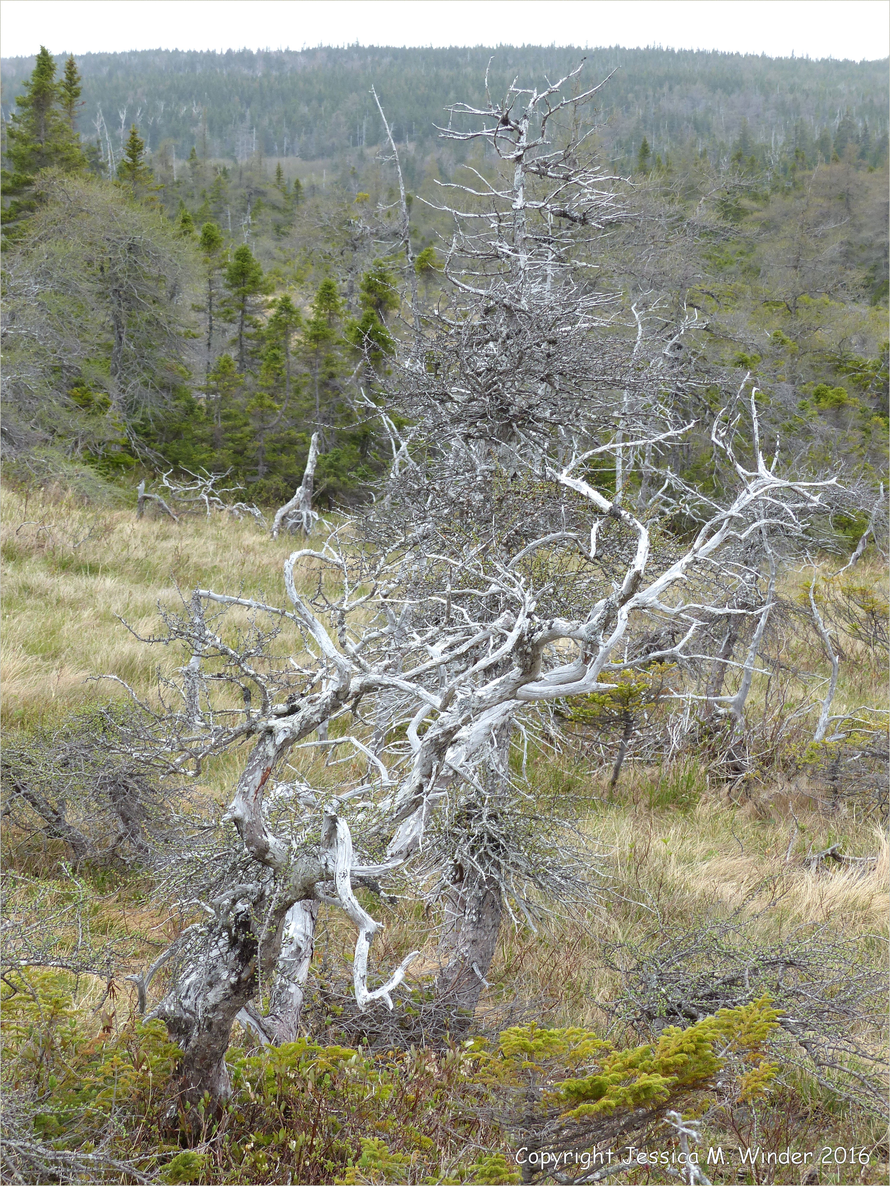 Bog on French Mountain 4 – Bare gnarled branches of stunted Eastern Larch growing in a bog on French Mountain along the Cabot Trail in the Cape Breton Highlands National Park, Nova Scotia, Canada, May 2016.