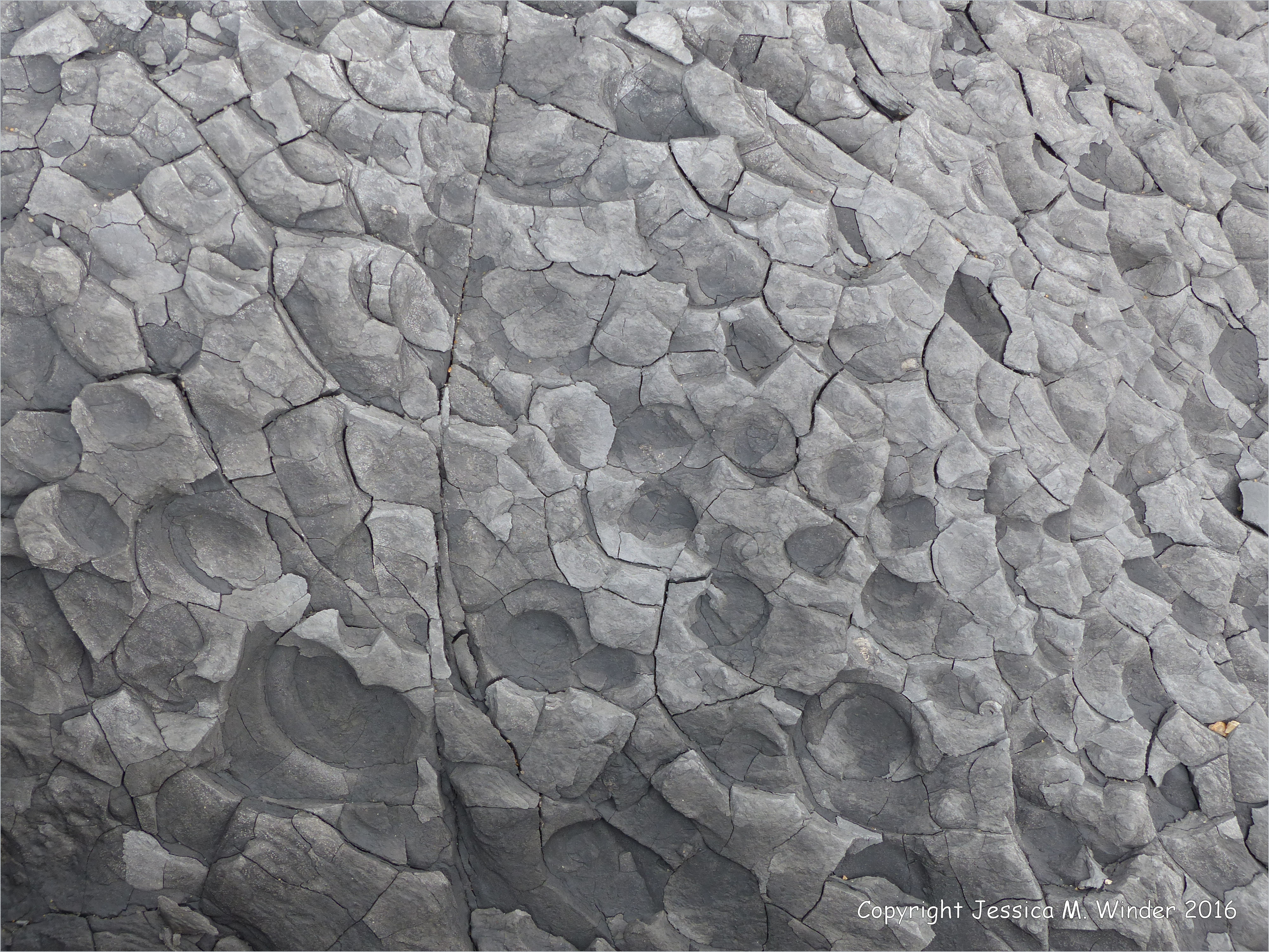 Beach Boulders at Charmouth Beach (East) 28 – Close-up of pattern and texture in a beach boulder detail from the Charmouth Mudstone Formation at Charmouth on the World Heritage Jurassic Coast in Dorset, England.