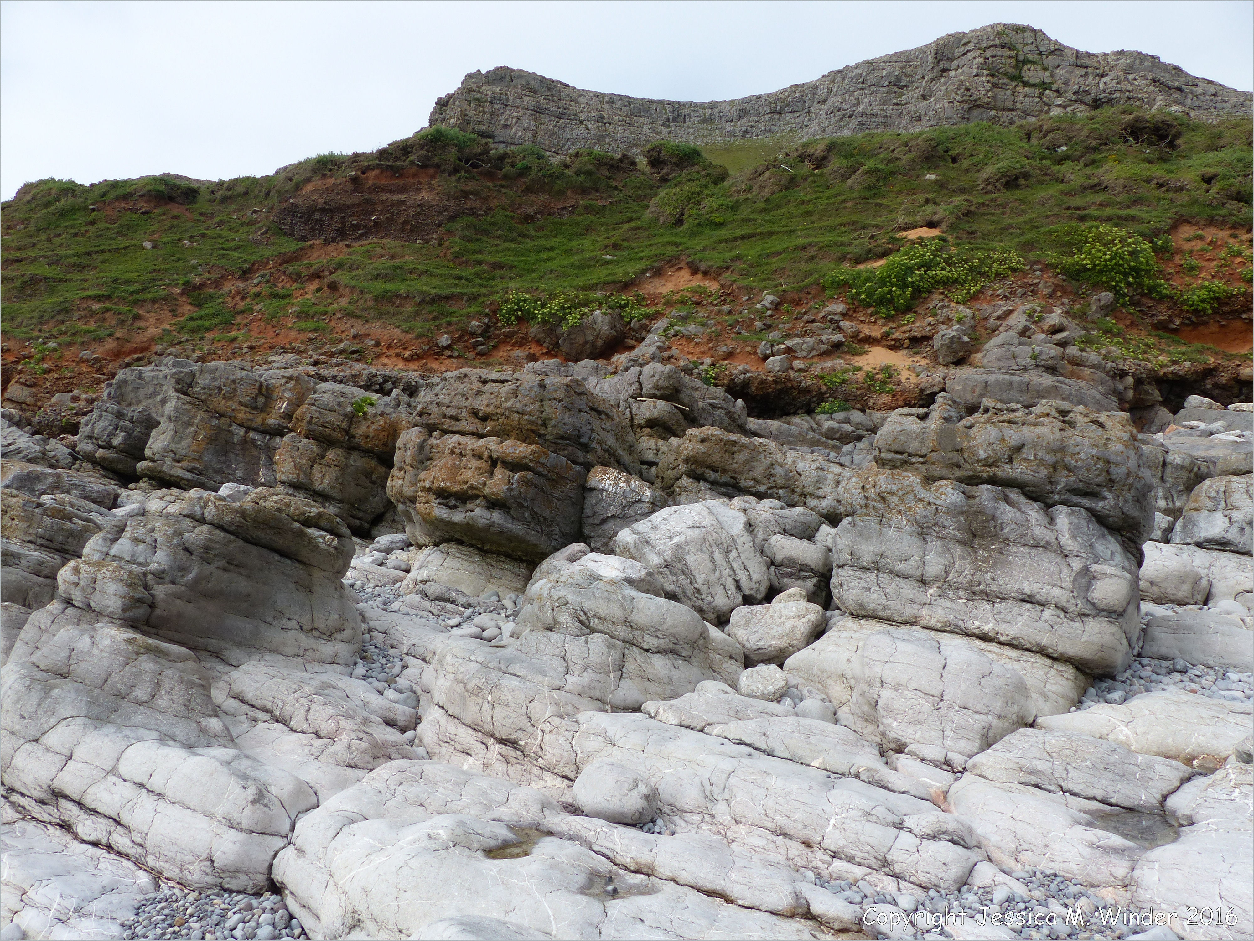 Water-worn Limestone (WHC2) 32 – Weathering of Carboniferous Black Rock Limestone Sub Group layers on the Worms Head Causeway in Gower, South Wales, showing the wearing, smoothing, and shaping effects of a combination of erosion by mechanical abrasion (waves carrying stones), acid dissolution (rain water) and bio-erosion (damage caused by micro-organisms and marine invertebrates).
