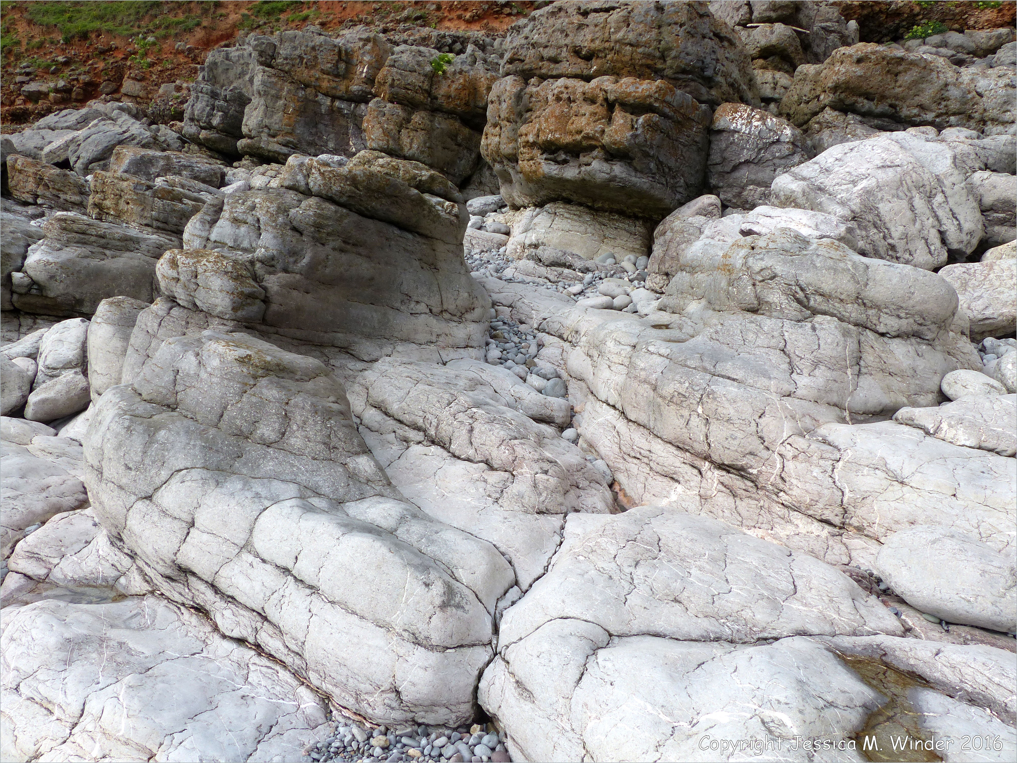 Water-worn Limestone (WHC2) 33 – Weathering of Carboniferous Black Rock Limestone Sub Group layers on the Worms Head Causeway in Gower, South Wales, showing the wearing, smoothing, and shaping effects of a combination of erosion by mechanical abrasion (waves carrying stones), acid dissolution (rain water) and bio-erosion (damage caused by micro-organisms and marine invertebrates).