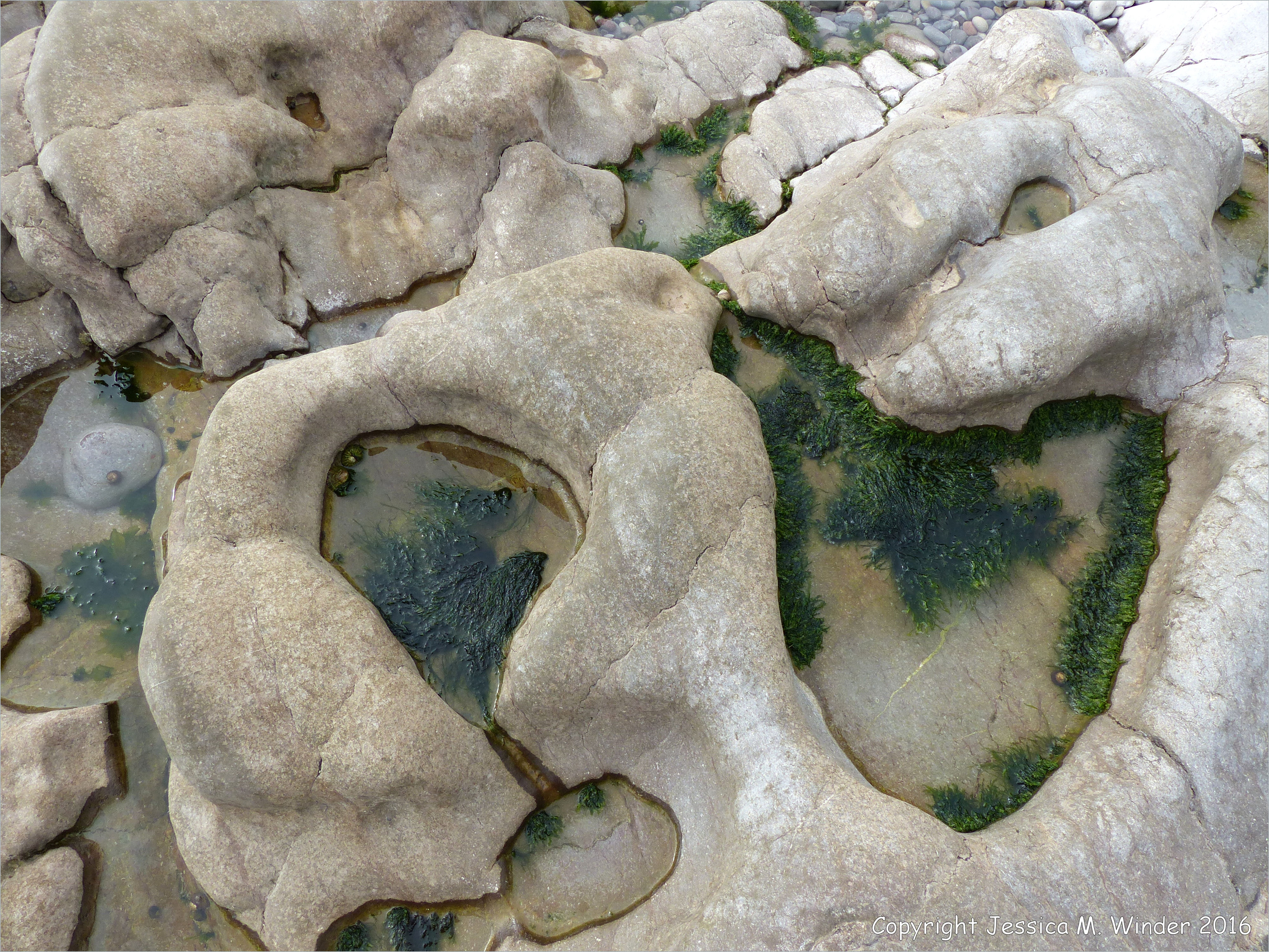 Water-worn Limestone (WHC2) 51 – Weathering of Carboniferous Black Rock Limestone Sub Group layers on the Worms Head Causeway in Gower, South Wales, showing the wearing, smoothing, and shaping effects of a combination of erosion by mechanical abrasion (waves carrying stones), acid dissolution (rain water) and bio-erosion (damage caused by micro-organisms and marine invertebrates). The pools occupy karstic features known as kamenitzas.