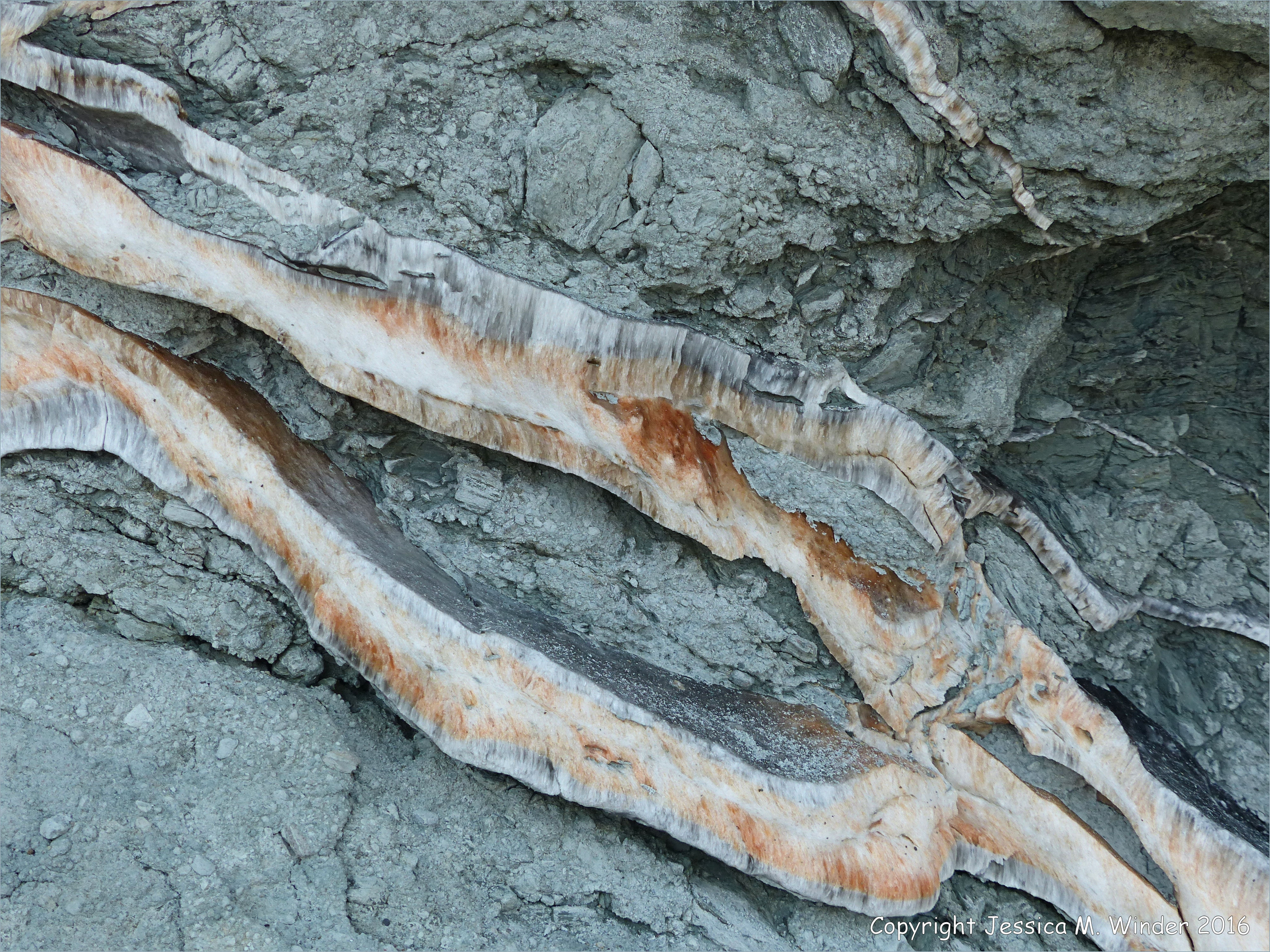 Satin Spar Gypsum at Clarke Head 3 – Orange and white crystal veins of satin spar gypsum in fault zone rocks at Clarke Head near Parrsboro on the northern shore of the Minas Basin (which is part of the Bay of Fundy) in Nova Scotia, Canada.