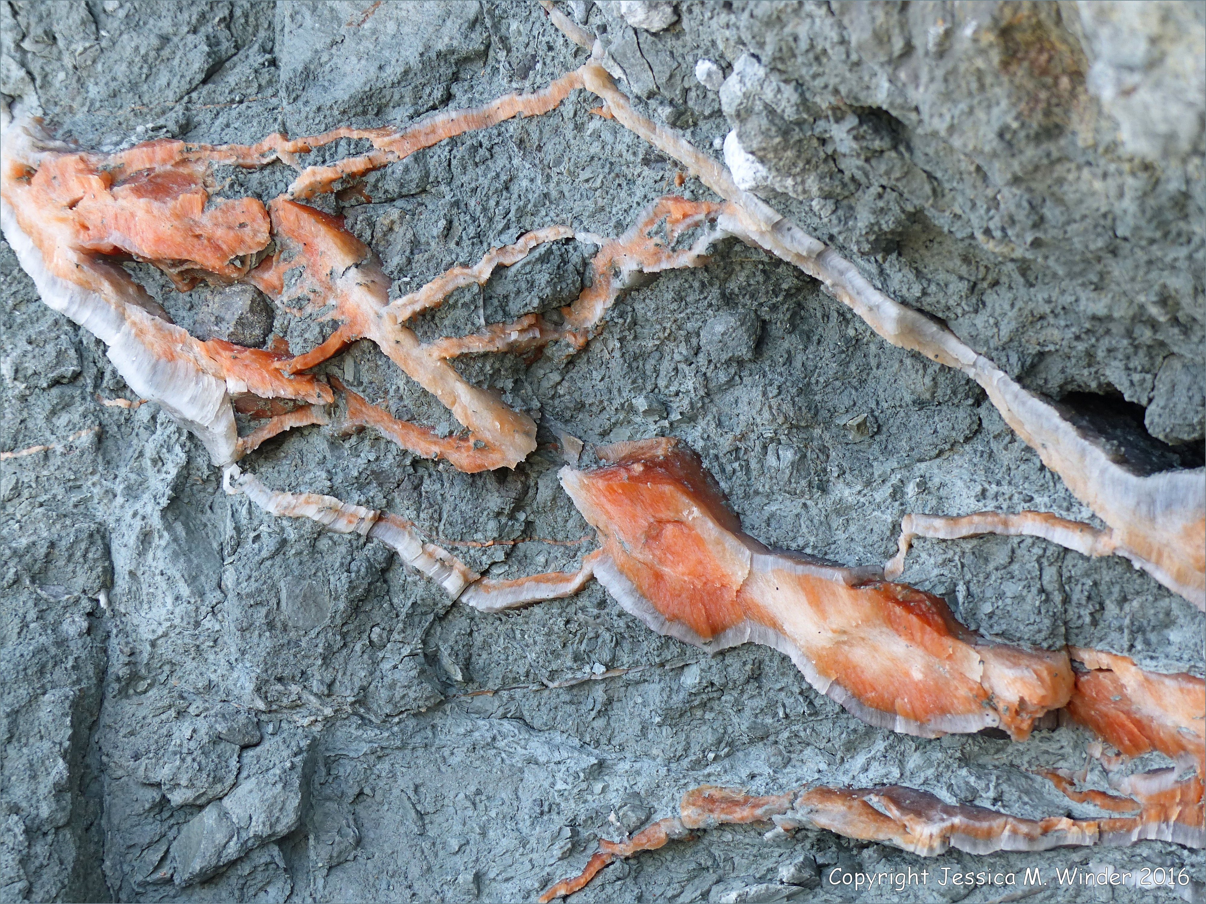 Satin Spar Gypsum at Clarke Head 8 – Orange and white crystal veins of satin spar gypsum in fault zone rocks at Clarke Head near Parrsboro on the northern shore of the Minas Basin (which is part of the Bay of Fundy) in Nova Scotia, Canada.