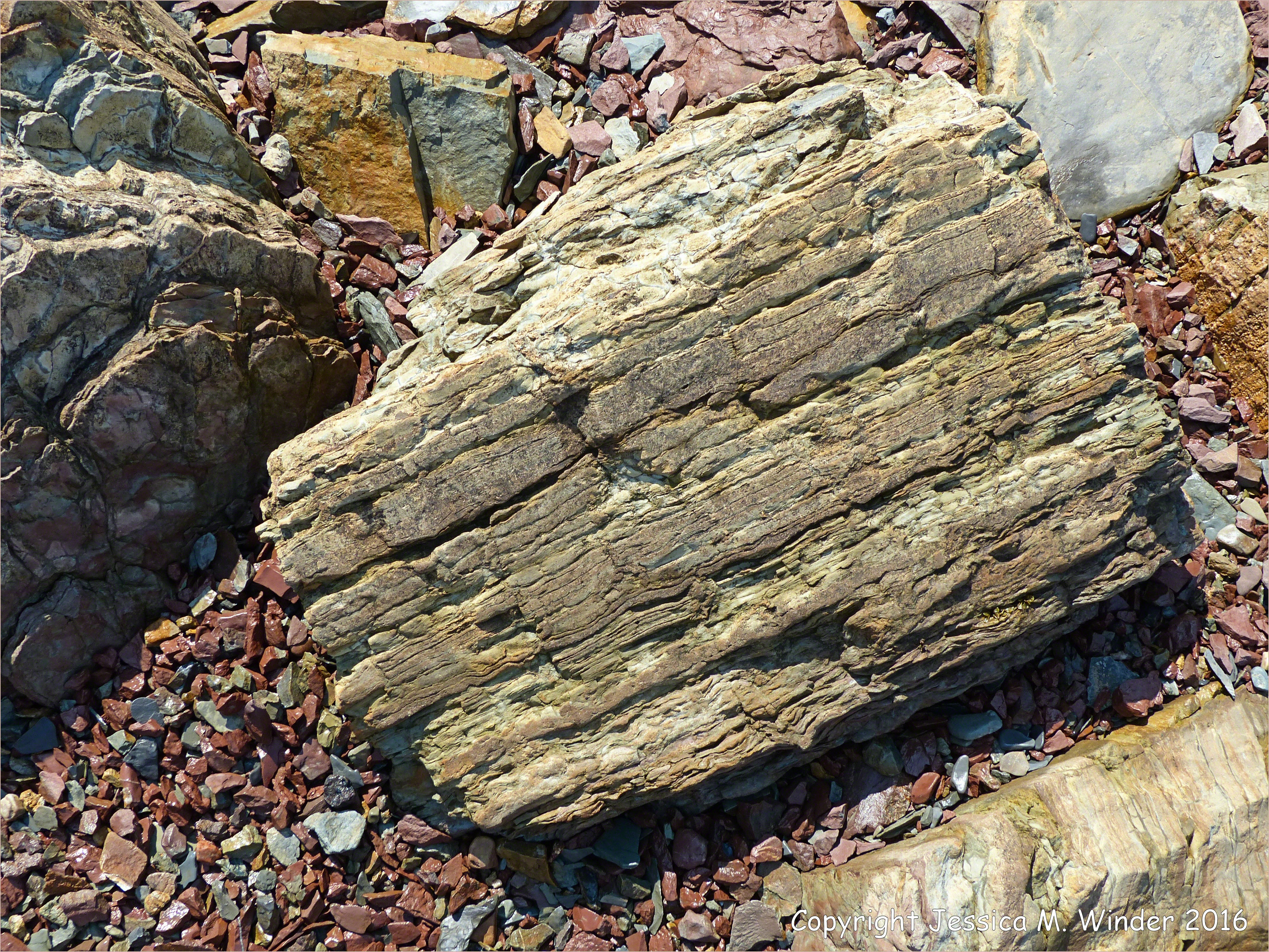 Fault Zone Rocks at Clarke Head 60 -Boulder on the beach from the many types represented in the fault zone at Clarke Head, Nova Scotia, Canada.