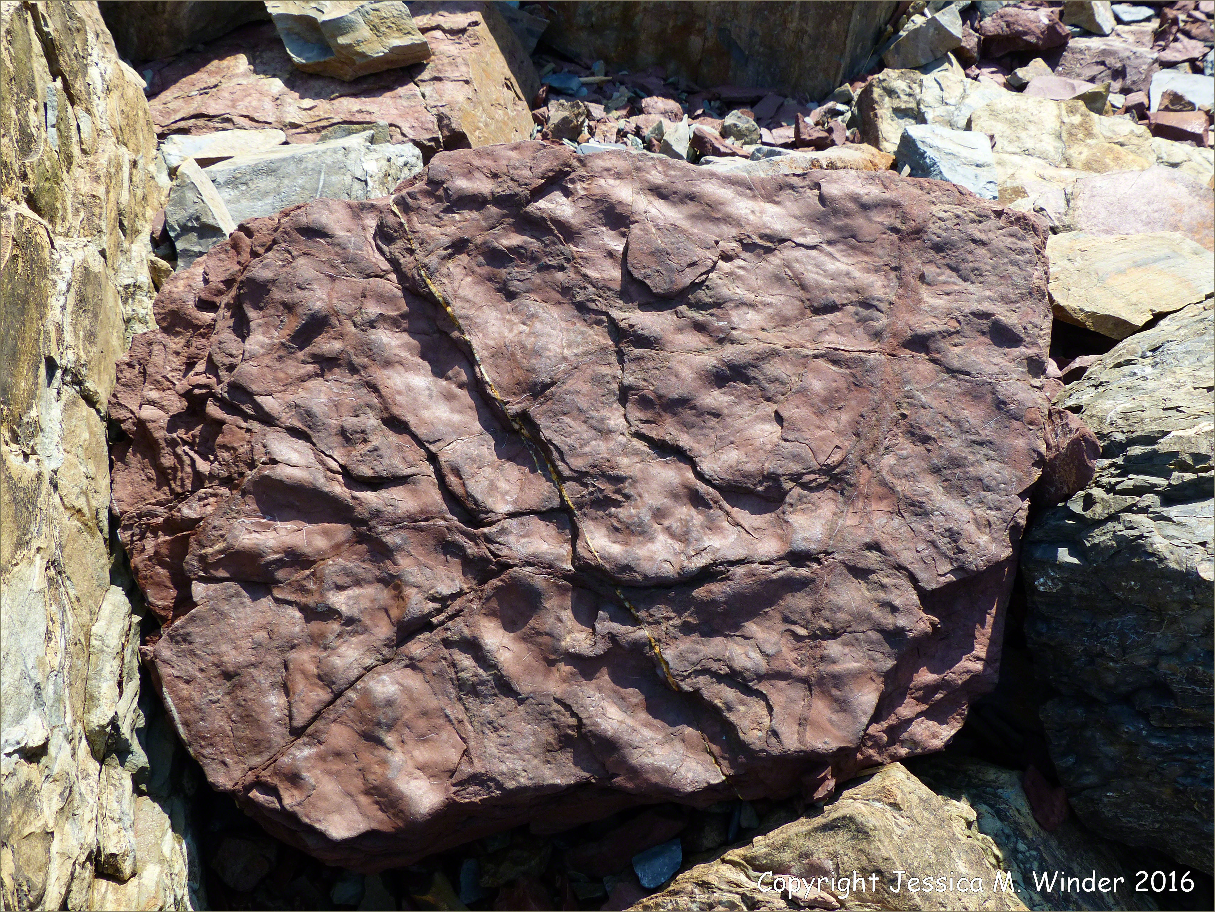Fault Zone Rocks at Clarke Head 62 -Boulder on the beach from the many types represented in the fault zone at Clarke Head, Nova Scotia, Canada.