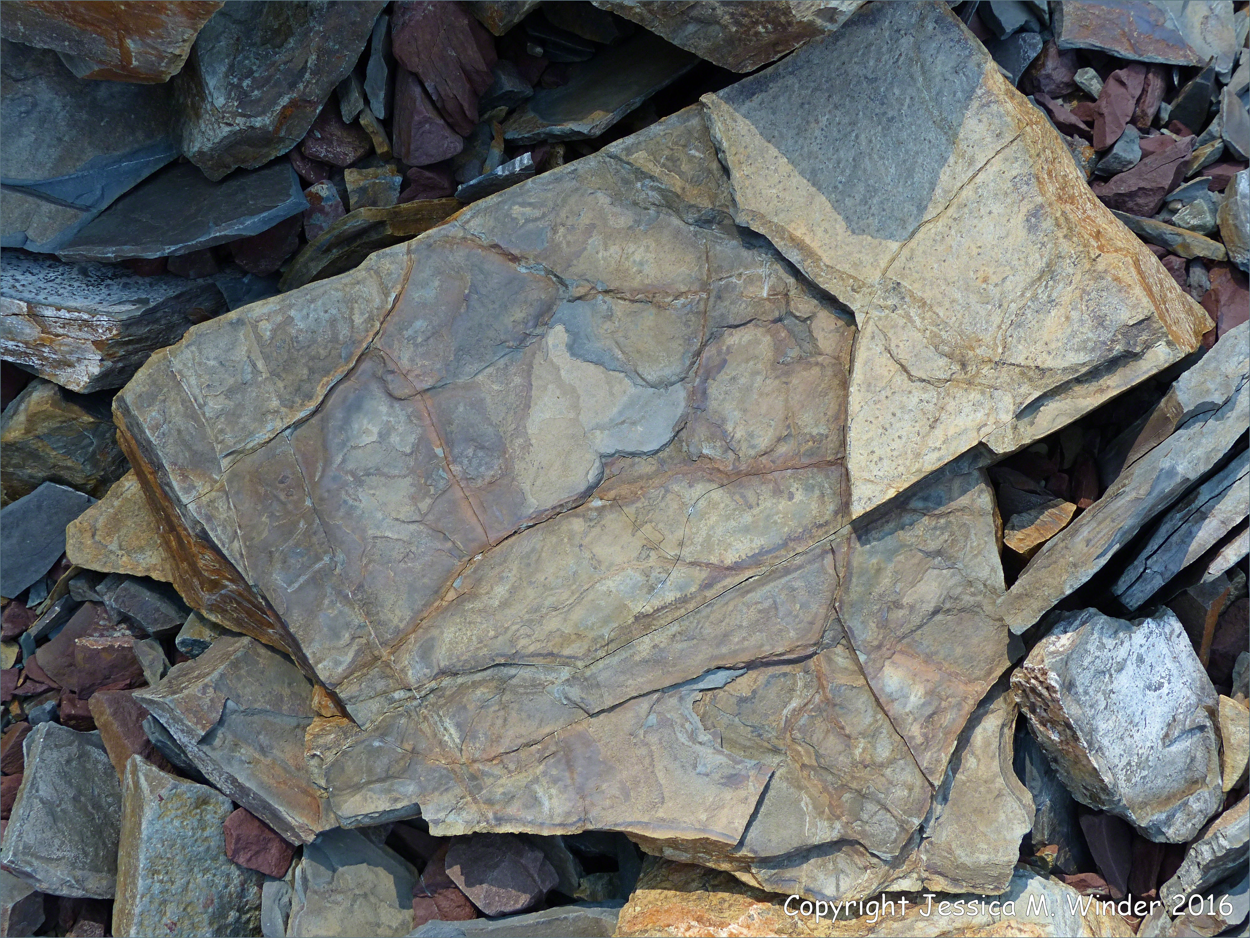 Fault Zone Rocks at Clarke Head 65 -Boulder on the beach from the many types represented in the fault zone at Clarke Head, Nova Scotia, Canada.