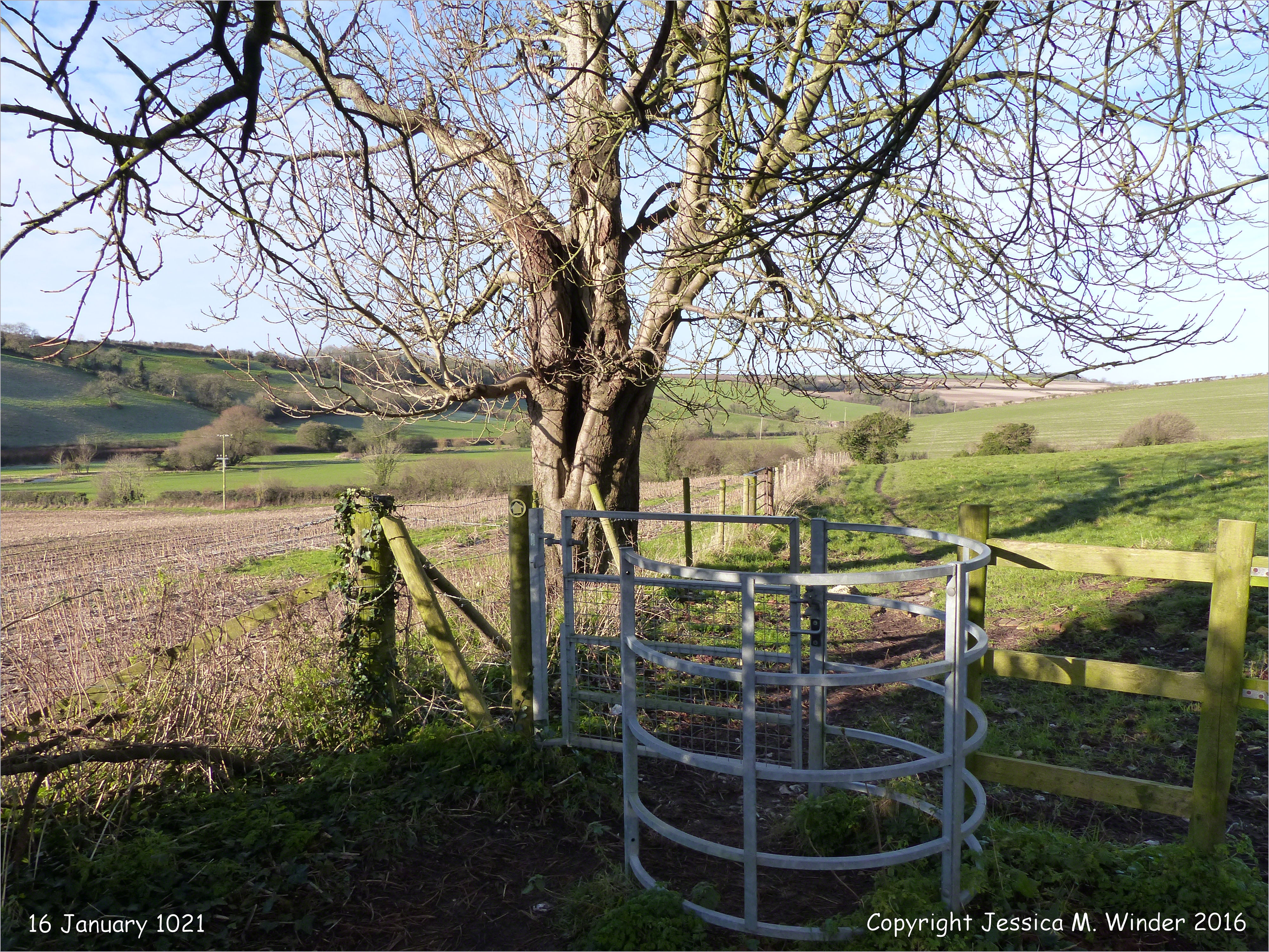 Seasonal Transitions – Stile 2 – Country view with stile on the Cerne Valley Trail, Dorset, England, 16 January 2016 at 1021 hours.