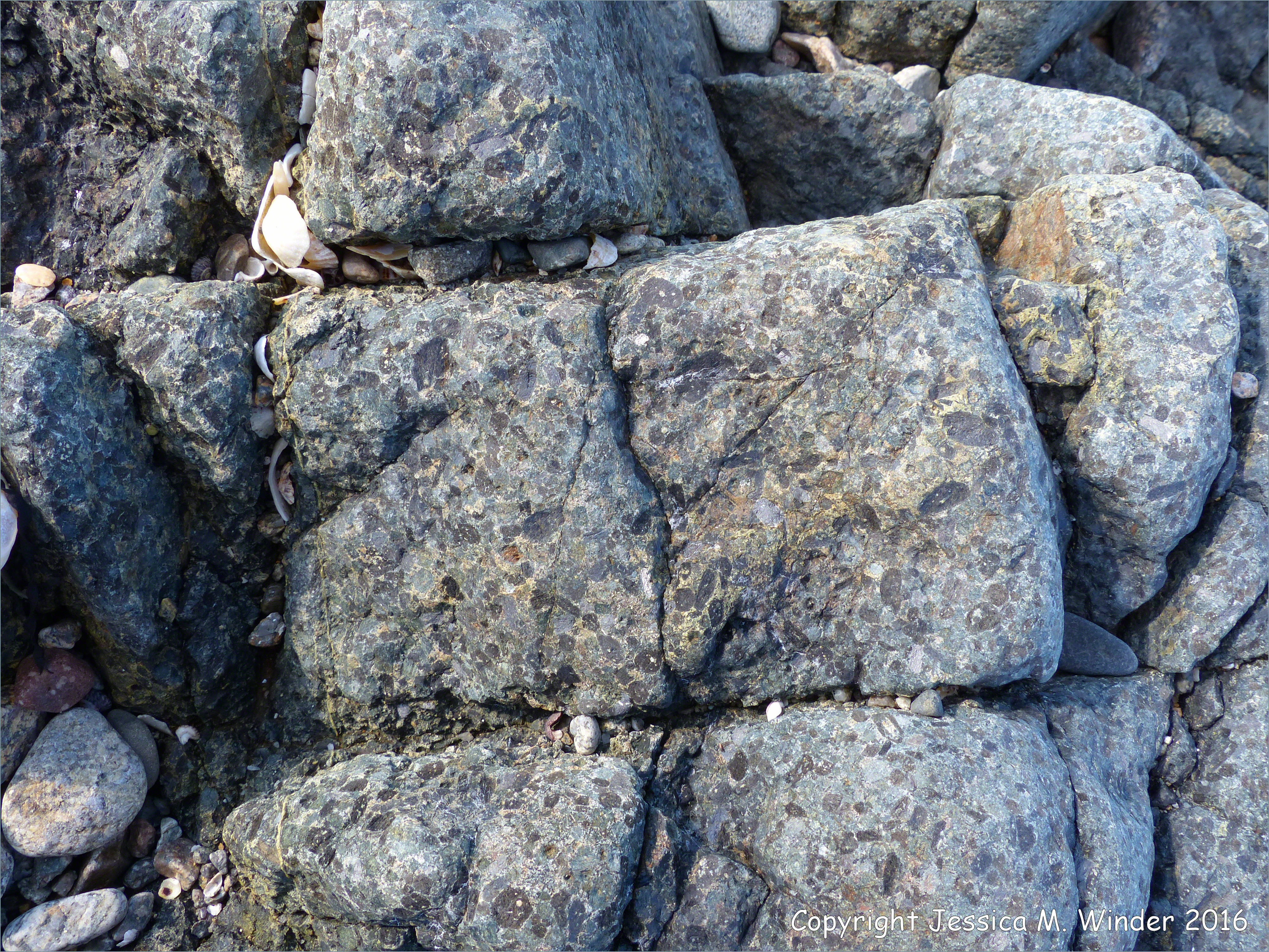 Vogesite Dyke at L’Eree 3 – Detail of a vogesite dyke that crosses the granite shore in an east-west direction at L’Eree in the Channel Island of Guernsey.