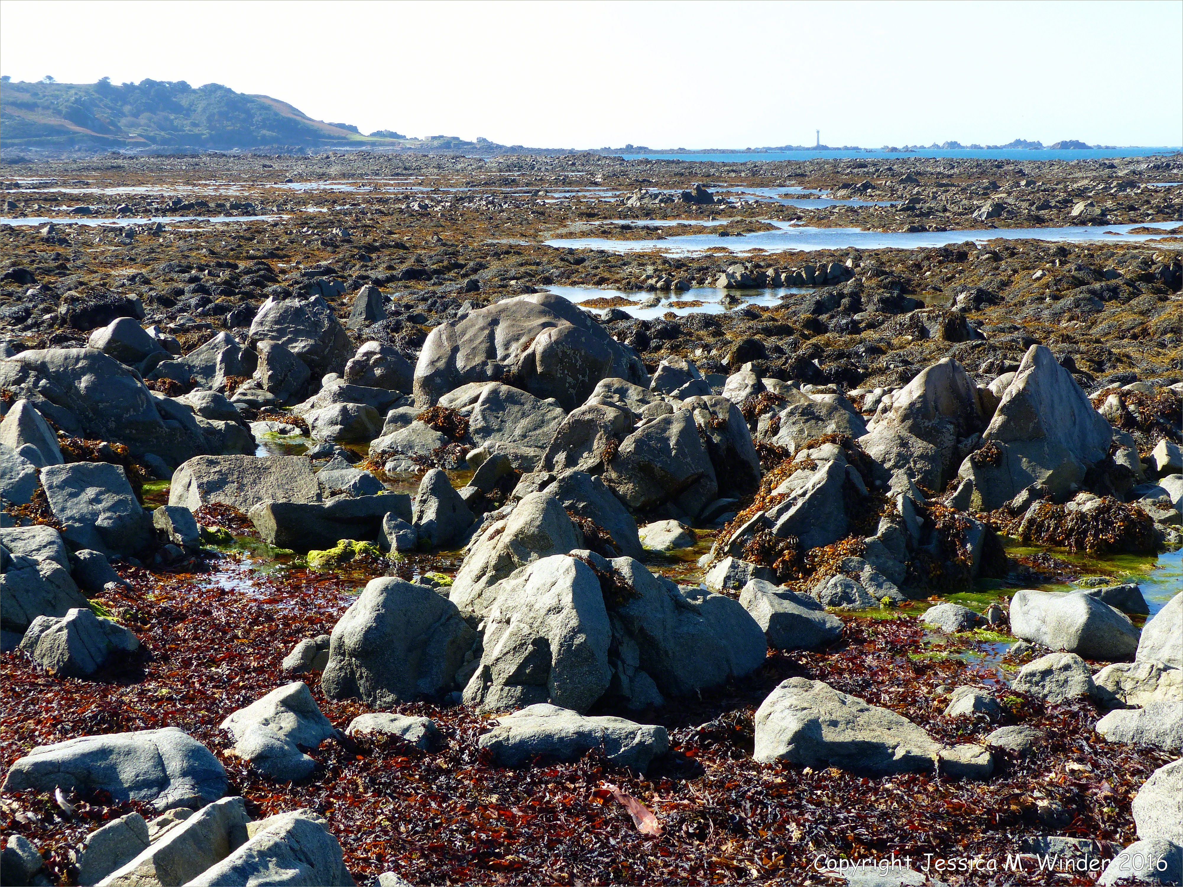 A Walk at Rocquaine Bay 29 – Vista of rocks and weed looking southwest on the shore at Rocquaine Bay on the west coast of the Channel Island of Guernsey