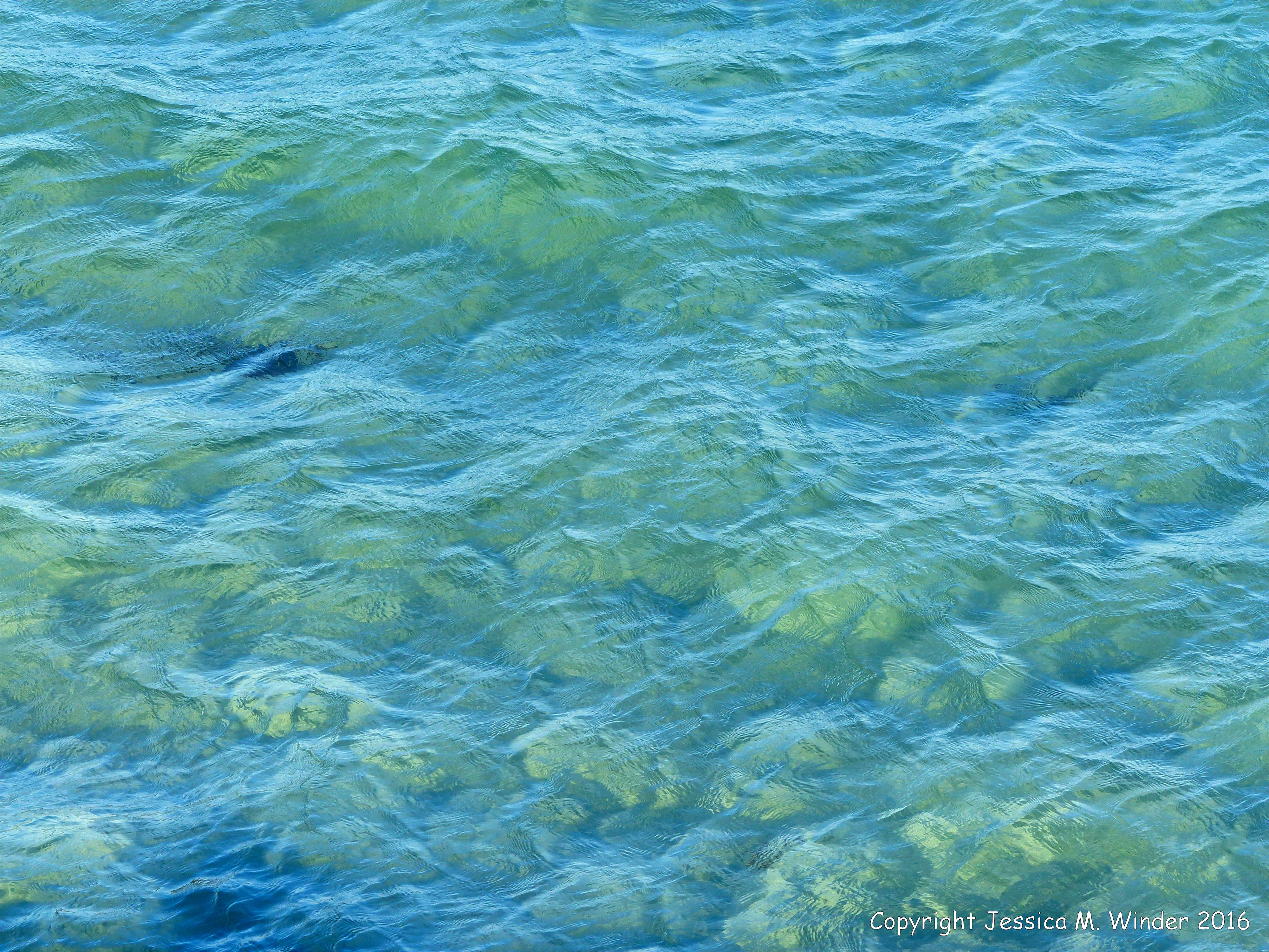 Portlet 10 – Texture of translucent blue sea water as it gently breaks over a sandy shore disturbing small yellow clouds of fine sediment with each wave. Photographed at Portlet Harbour in the Channel Island of Guernsey by Jessica M. Winder.