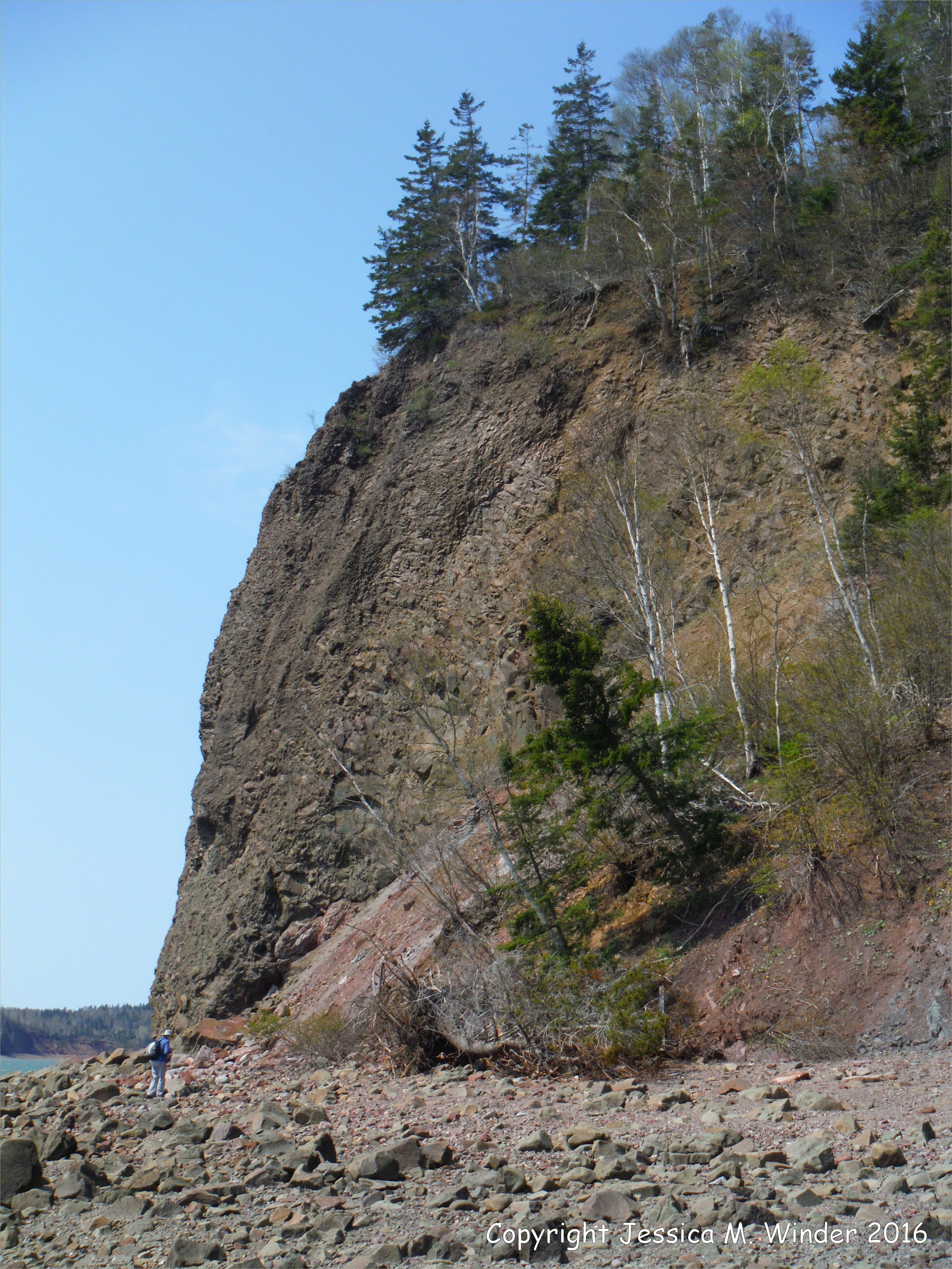 Rocks at Wasson Bluff 1 – Fault that places the North Mountain Basalt in contact with the Triassic to Jurassic Partridge Island Member of the Upper Blomidon Formation at wasson Bluff near Parrsboro, Nova Scotia, Canada. See the small human figure at its base for scale.