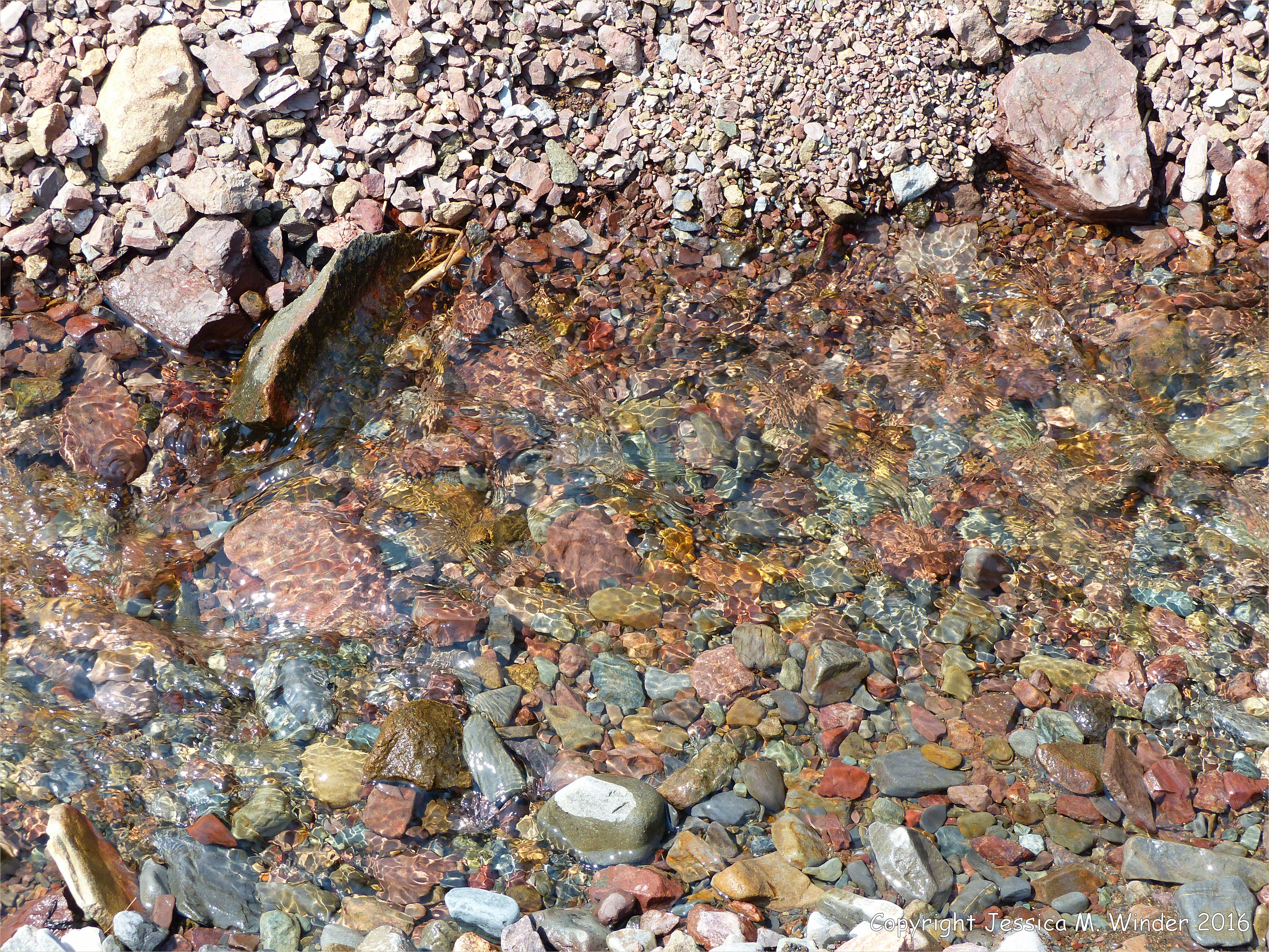 Rocks at Wasson Bluff 7 – Stream across the coloured beach pebbles at Wasson Bluff, near Parrsboro, Nova Scotia, Canada.