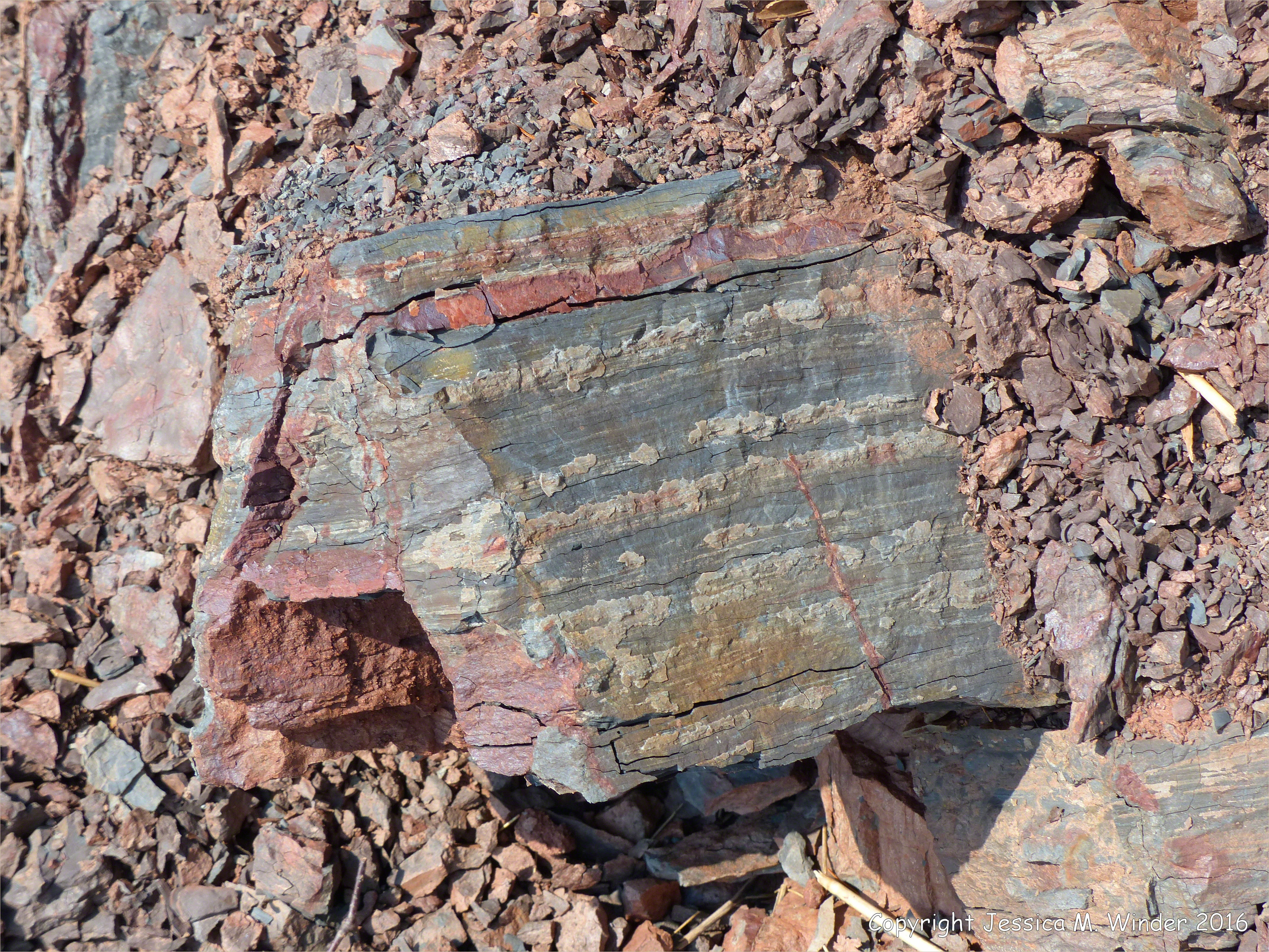 Rocks at Wasson Bluff 8 – Triassic-Jurassic Blomidon Formation rocks at Wasson Bluff, near Parrsboro, Nova Scotia, Canada. (All rock identifications are tentative and subject to verification.)
