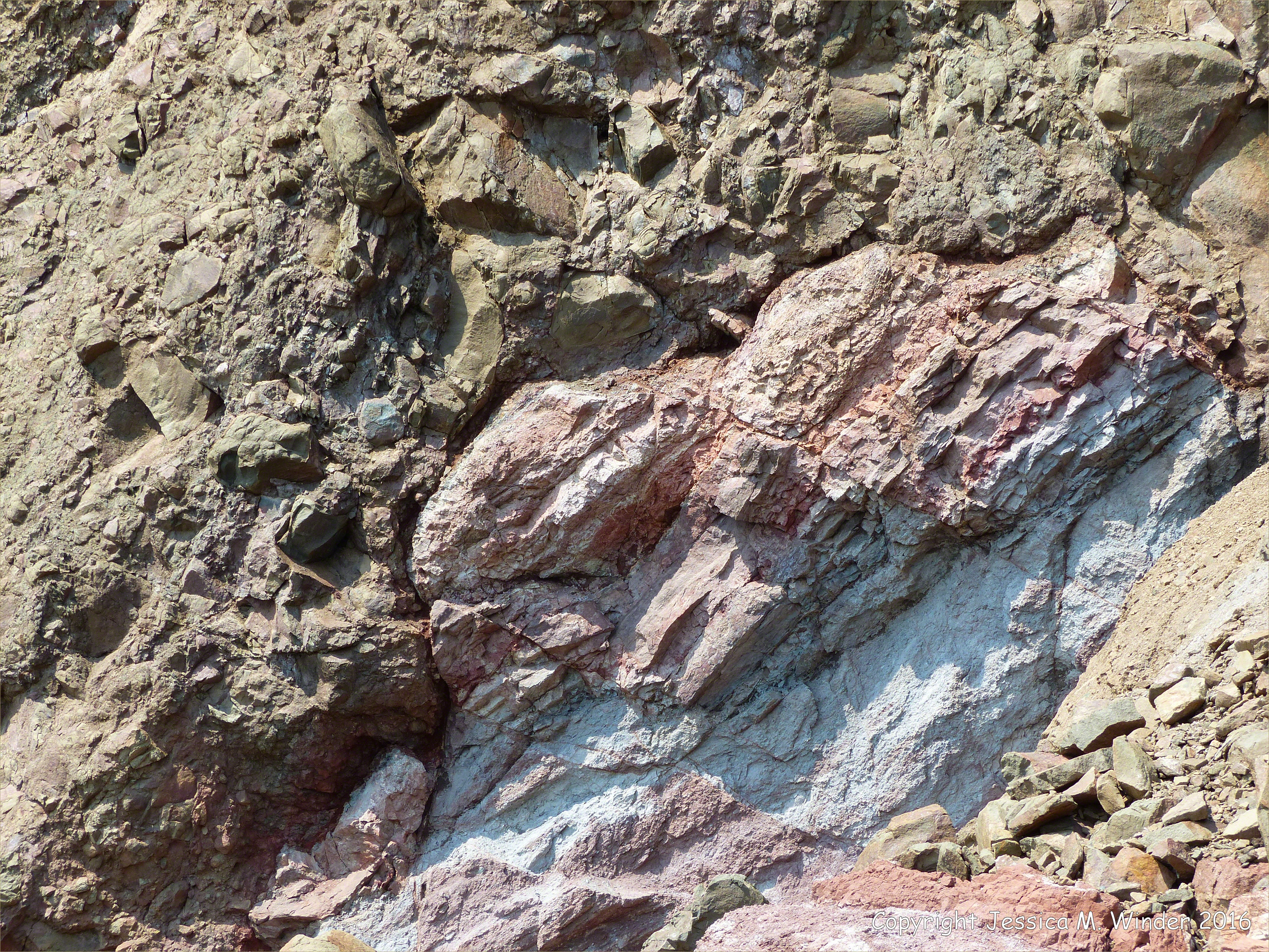Rocks at Wasson Bluff 25 – Close-up of the contact between the Jurassic North Mountain Basalt and the Triassic to Jurassic Partridge Island Member of the Blomidon Formation on the east side of Wasson Bluff, near Parrsboro, Nova Scotia, Canada. (All rock identifications are tentative and subject to verification.)