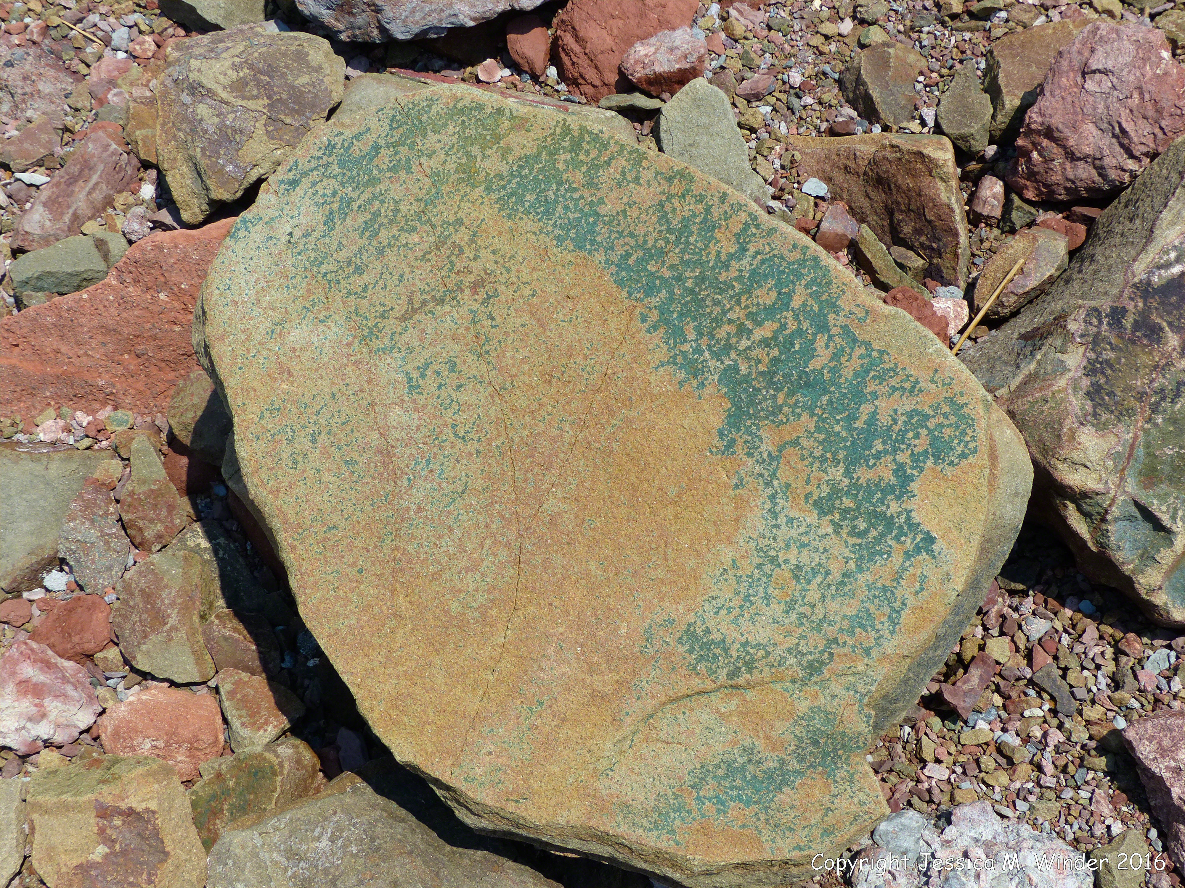 Rocks at Wasson Bluff 26 – Boulder of Jurassic North Mountain Basalt boulder at Wasson Bluff, near Parrsboro. Nova Scotia, Canada. (All rock identifications are tentative and subject to verification.)