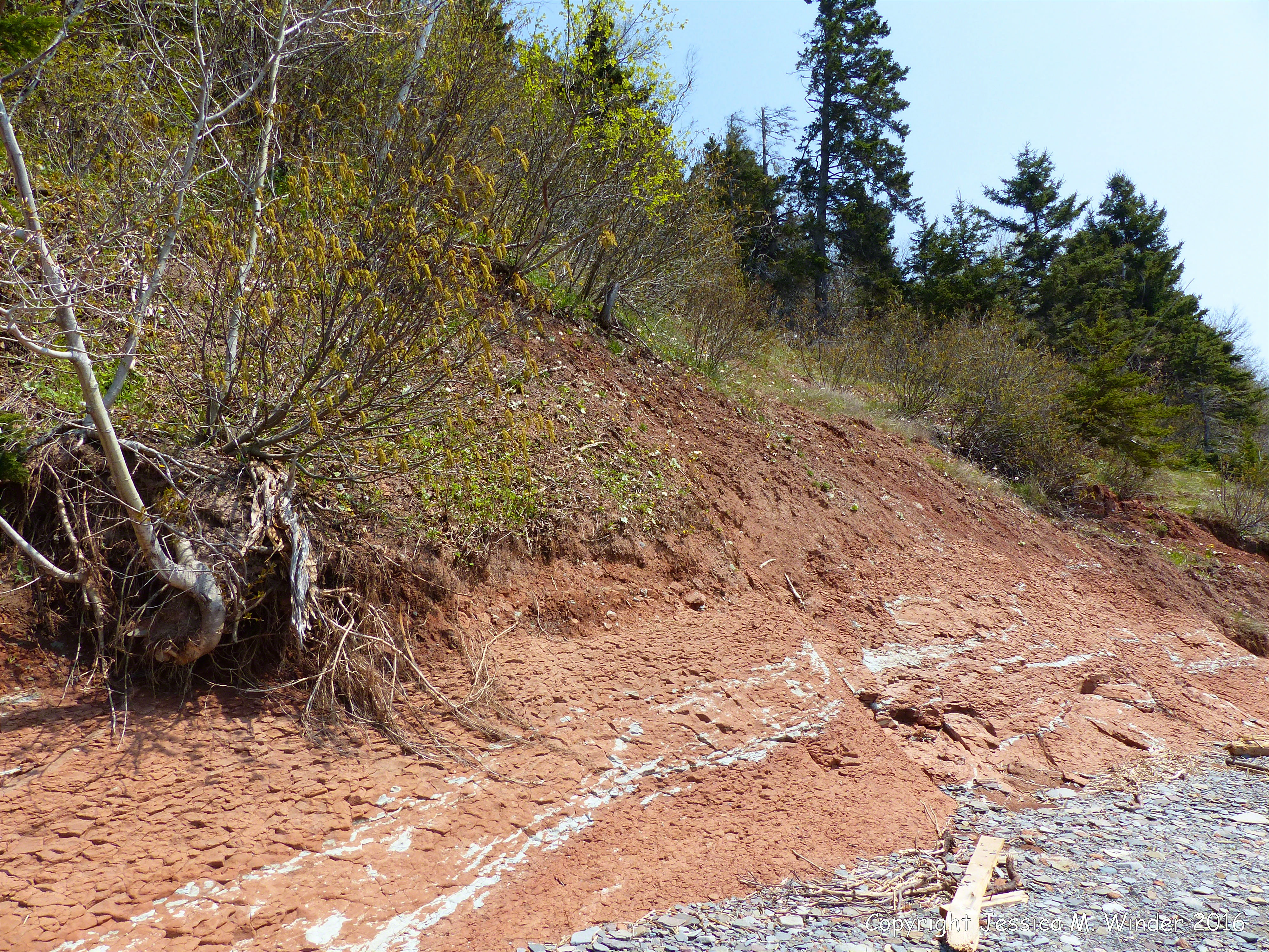 Rocks at Wasson Bluff 39 – Jurassic McCoy Brook Formation rocks east of Wasson Bluff, near Parrsboro, Nova Scotia, Canada. (All rock identifications are tentative and subject to verification.)
