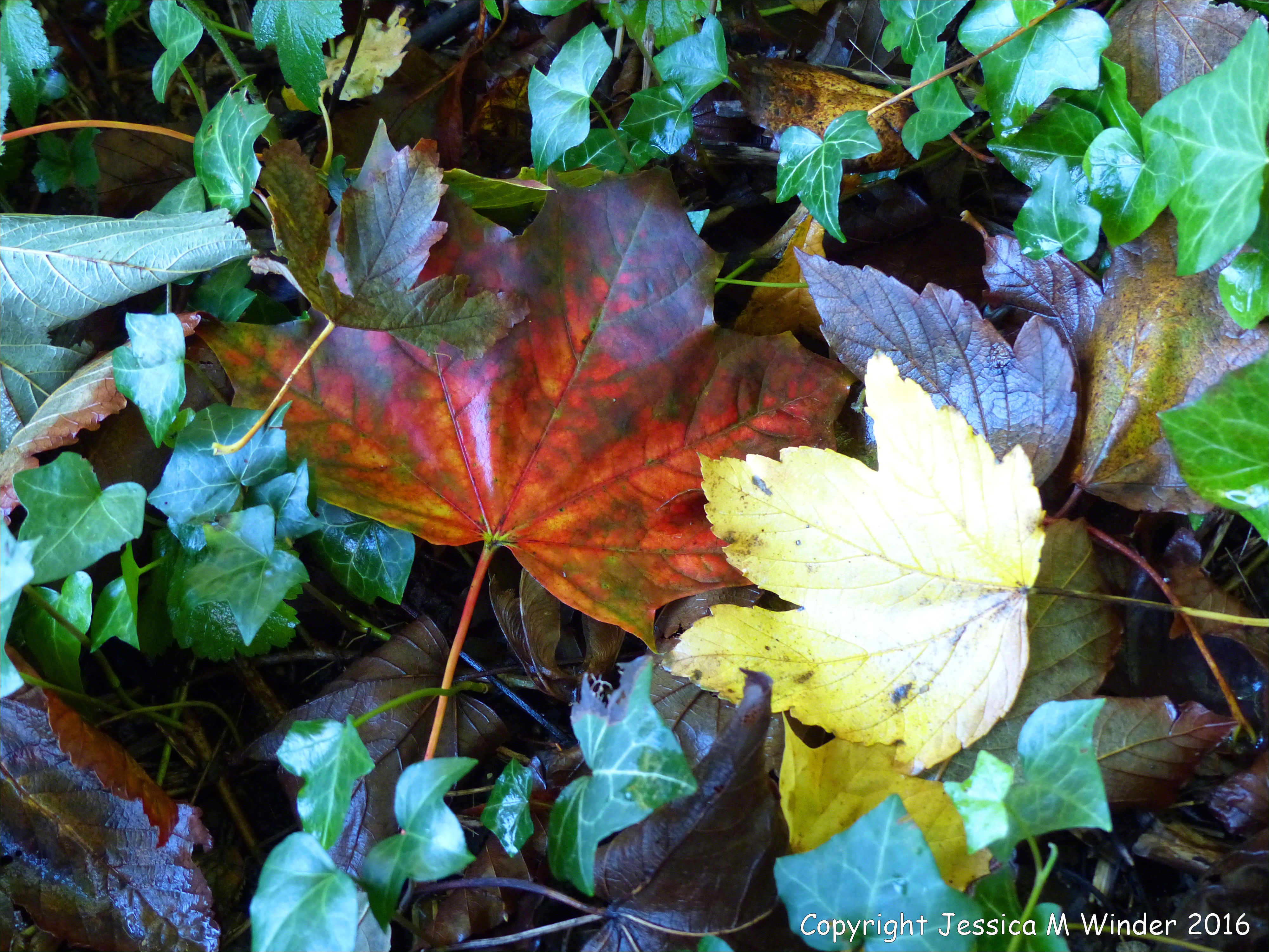 October Leaves 6 – The beginning of autumn leaf fall, with brightly coloured and sometimes sunlit leaves. Photographed in and around a Dorset hedgerow in England.