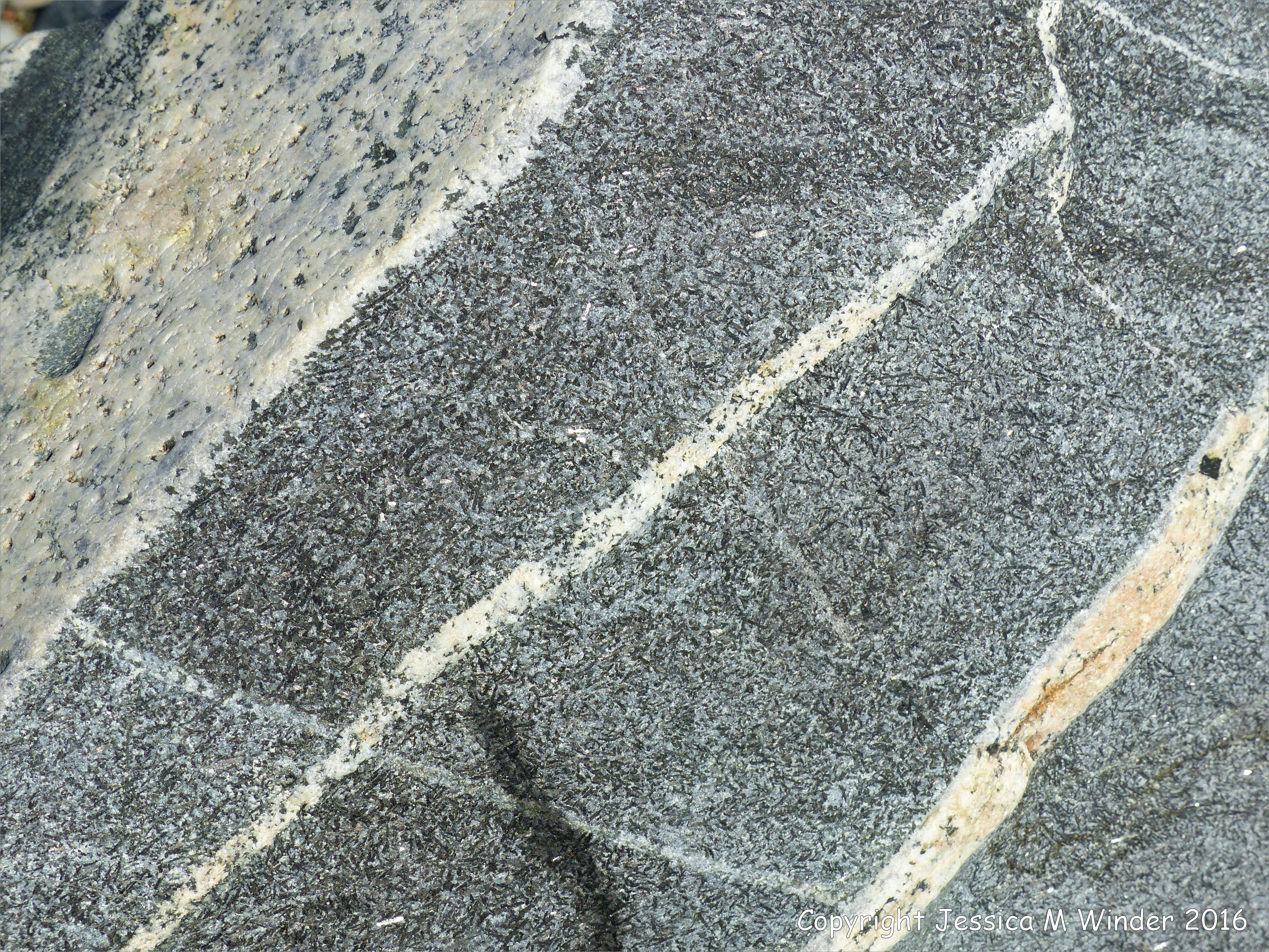 Rocks at Spur Bay 6 – Close-up of St Peter Port Gabbro with veins at Spur Bay on the Channel Island of Guernsey