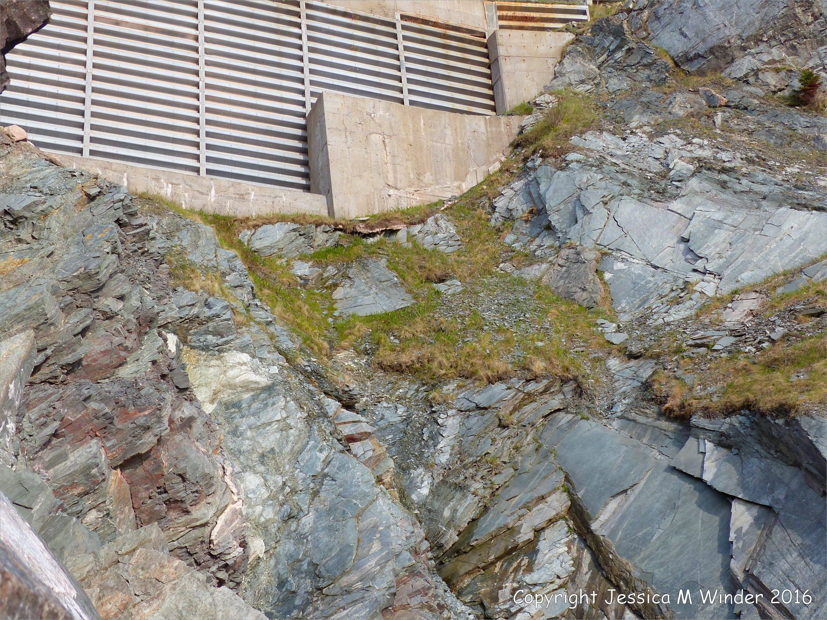 Rocks at Presqu’ile 14 – Steeply inclined bedding planes or cleavage surfaces of phyllite rock beneath the coast road called the Cabot Trail at Presqu’ile near Pillar Rock along the Cabot Trail in Cape Breton Island, Nova Scotia, Canada.