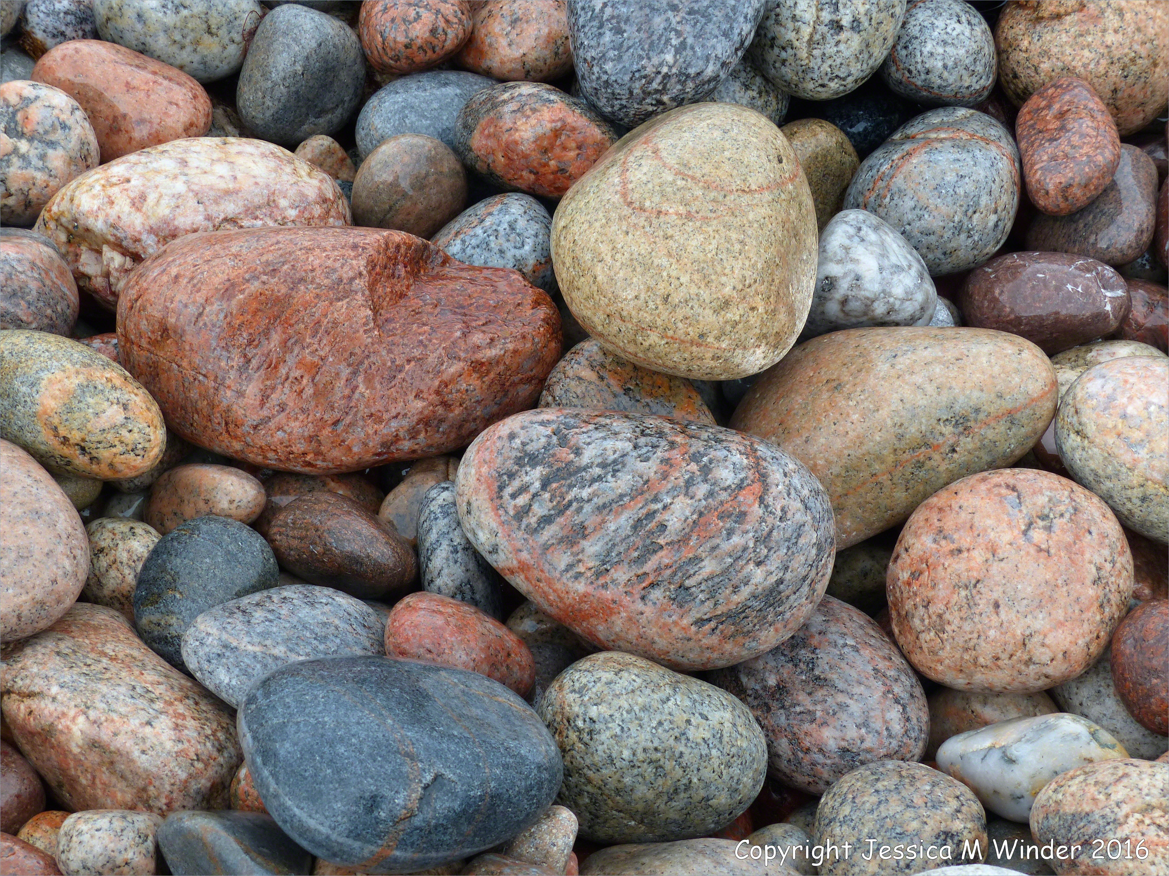 Pleasant Bay Pebbles 17 – At Pleasant Bay in Cape Breton Island, Nova Scotia, Canada, on the Cabot Trail in the Cape Breton Highlands National Park, the village sits on Carboniferous limestone rocks but the pebbles on its beach are mostly composed of much older igneous and metamorphic rocks that have been washed down from the surrounding mountains.