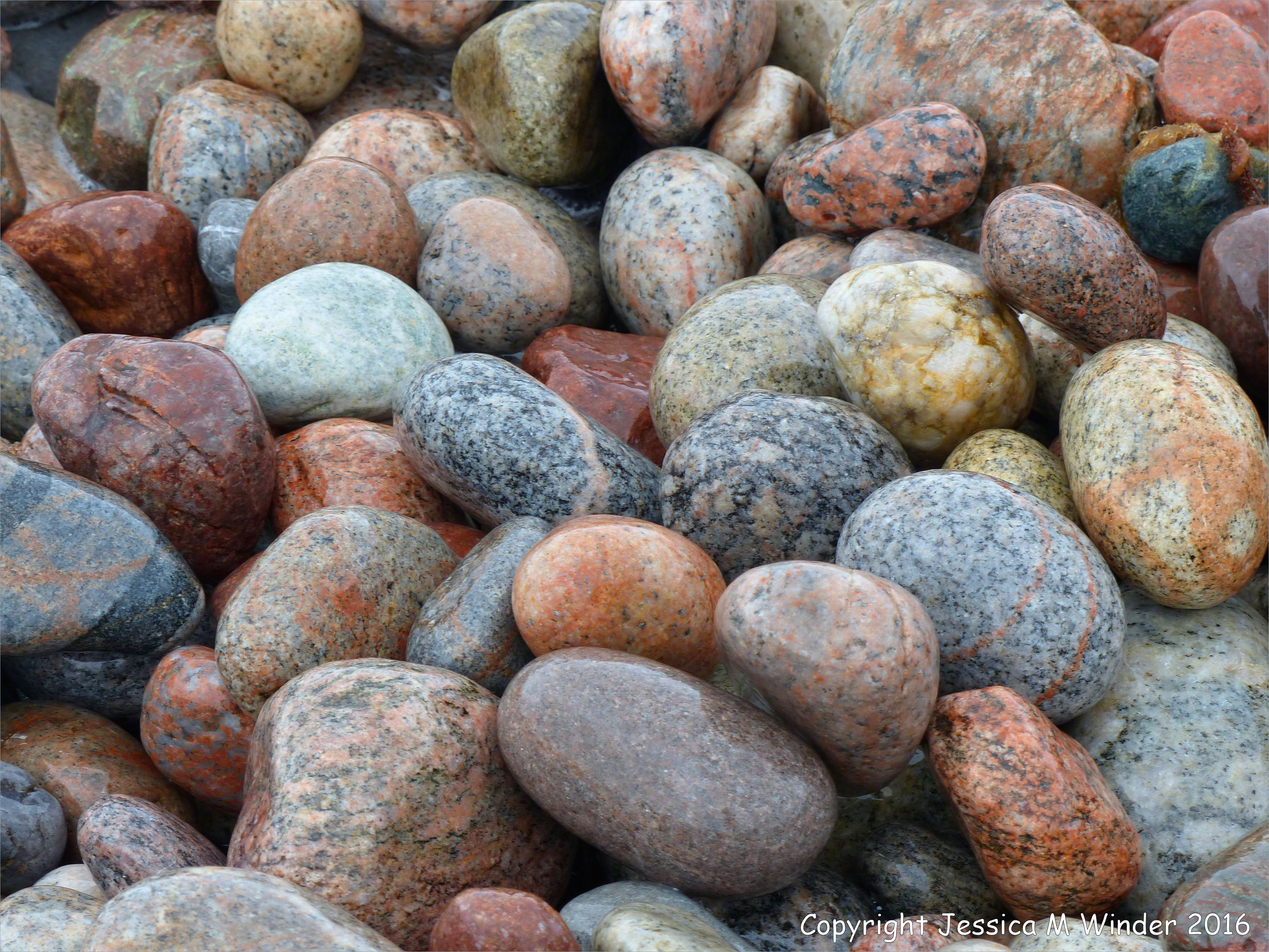 Pleasant Bay Pebbles 18 – At Pleasant Bay in Cape Breton Island, Nova Scotia, Canada, on the Cabot Trail in the Cape Breton Highlands National Park, the village sits on Carboniferous limestone rocks but the pebbles on its beach are mostly composed of much older igneous and metamorphic rocks that have been washed down from the surrounding mountains.