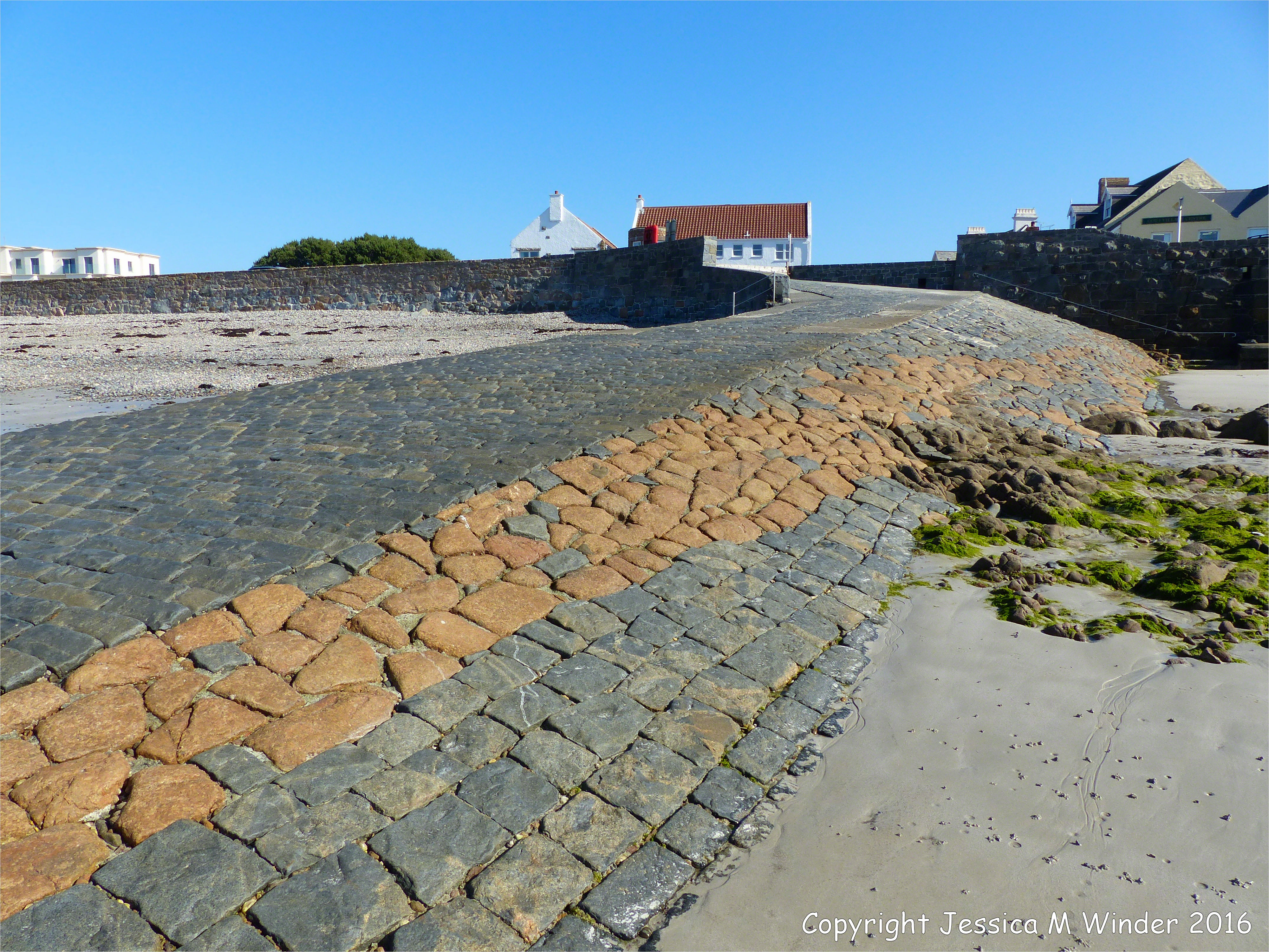 Cobo Bay 36 – Stone slipway of contrasting colours made of dark grey Bordeaux Diorite and orange Cobo Granite at Cobo Bay on the Channel Island of Guernsey.