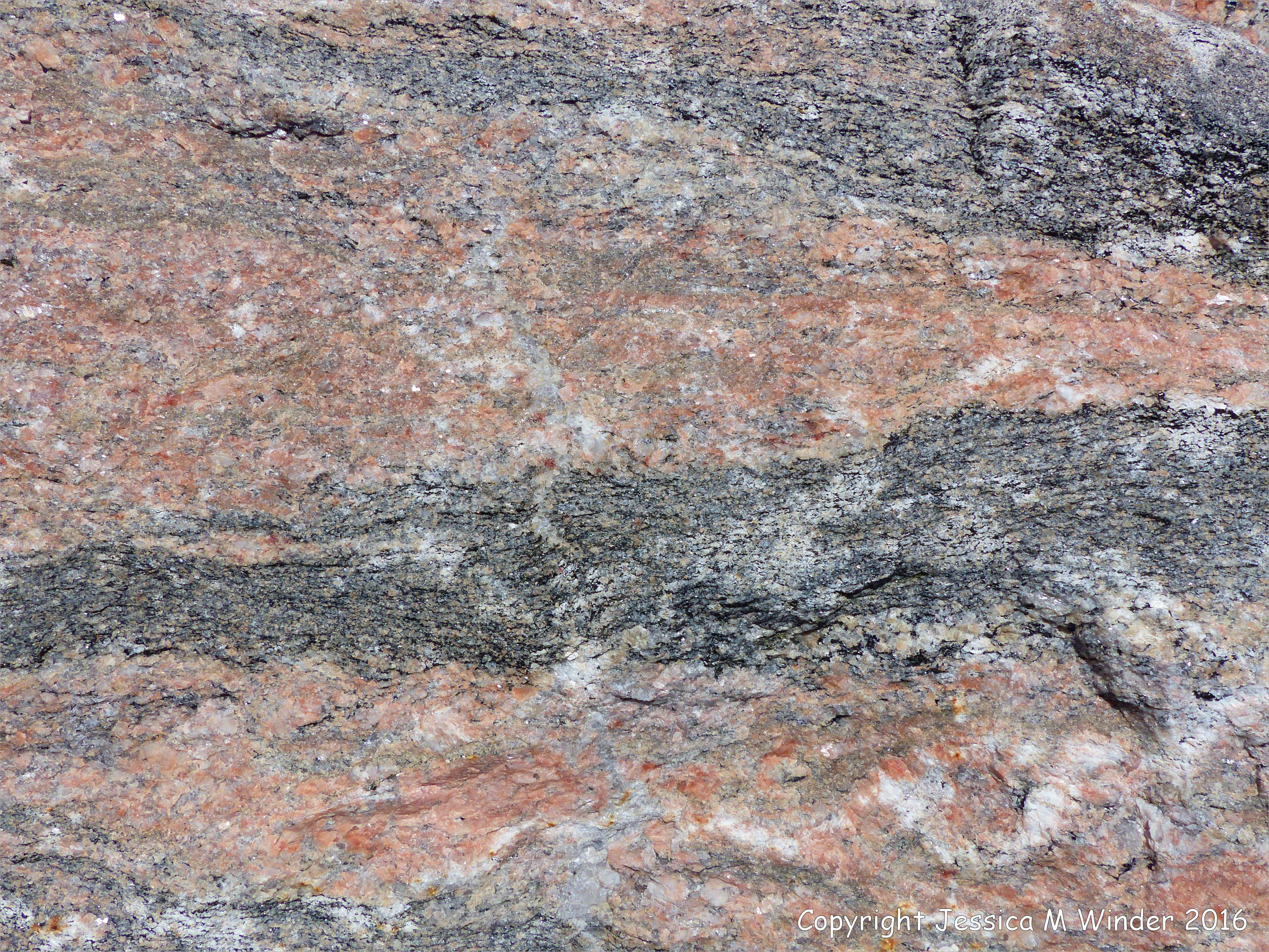 Rock Texture & Pattern at White Point 7 – Texture and pattern in Devonian plutonic rocks used as rip-rap at White Point harbour in Cape Breton Island, Nova Scotia, Canada, on the Cabot Trail. These rip-rap boulders come from the Black Brook Granitic Suite and include granitic gneiss intruded into biotite schist .